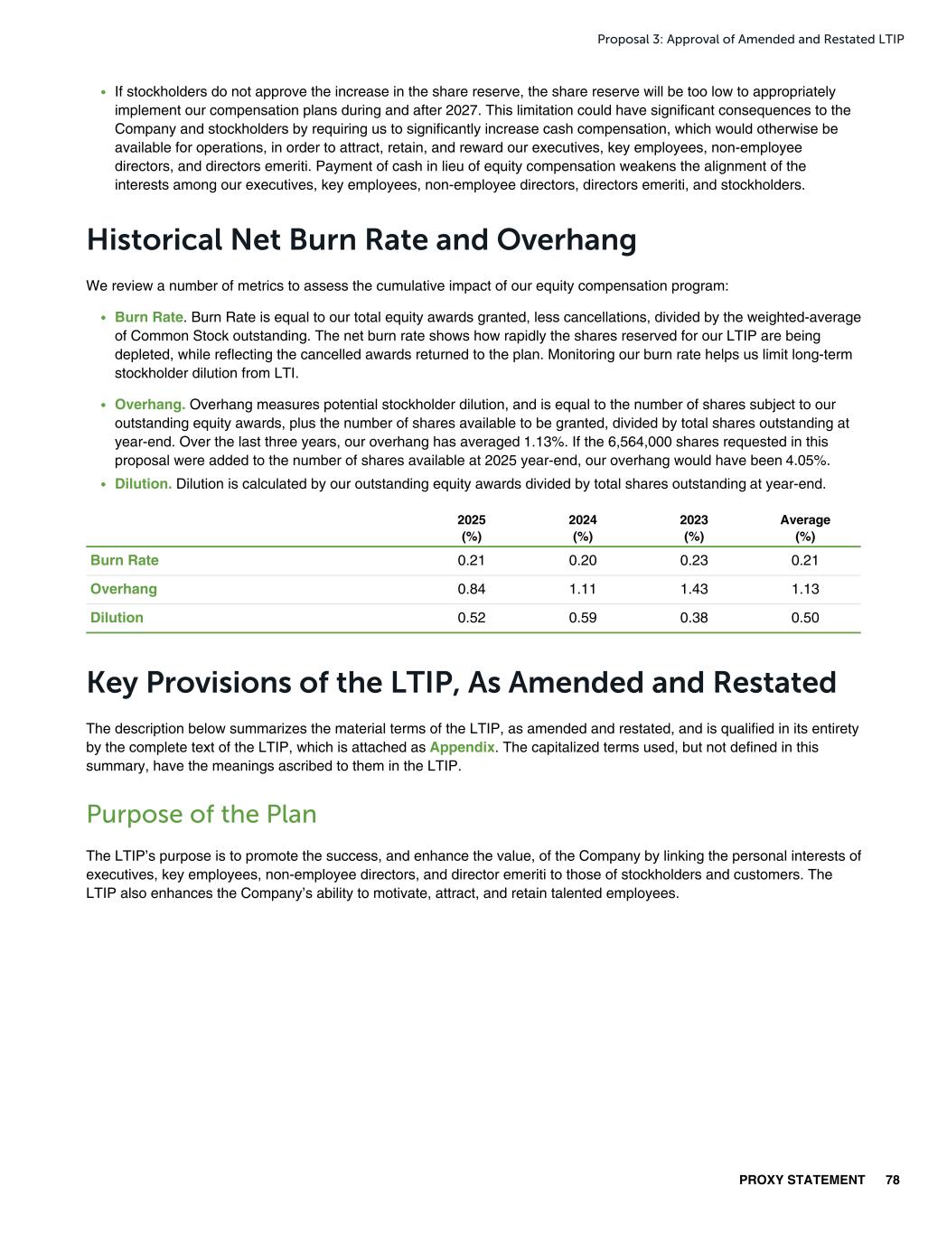 • If stockholders do not approve the increase in the share reserve, the share reserve will be too low to appropriately implement our compensation plans during and after 2027. This limitation could have significant consequences to the Company and stockholders by requiring us to significantly increase cash compensation, which would otherwise be available for operations, in order to attract, retain, and reward our executives, key employees, non-employee directors, and directors emeriti. Payment of cash in lieu of equity compensation weakens the alignment of the interests among our executives, key employees, non-employee directors, directors emeriti, and stockholders. Historical Net Burn Rate and Overhang We review a number of metrics to assess the cumulative impact of our equity compensation program: • Burn Rate. Burn Rate is equal to our total equity awards granted, less cancellations, divided by the weighted-average of Common Stock outstanding. The net burn rate shows how rapidly the shares reserved for our LTIP are being depleted, while reflecting the cancelled awards returned to the plan. Monitoring our burn rate helps us limit long-term stockholder dilution from LTI. • Overhang. Overhang measures potential stockholder dilution, and is equal to the number of shares subject to our outstanding equity awards, plus the number of shares available to be granted, divided by total shares outstanding at year-end. Over the last three years, our overhang has averaged 1.13%. If the 6,564,000 shares requested in this proposal were added to the number of shares available at 2025 year-end, our overhang would have been 4.05%. • Dilution. Dilution is calculated by our outstanding equity awards divided by total shares outstanding at year-end. 2025 (%) 2024 (%) 2023 (%) Average (%) Burn Rate 0.21 0.20 0.23 0.21 Overhang 0.84 1.11 1.43 1.13 Dilution 0.52 0.59 0.38 0.50 Key Provisions of the LTIP, As Amended and Restated The description below summarizes the material terms of the LTIP, as amended and restated, and is qualified in its entirety by the complete text of the LTIP, which is attached as Appendix. The capitalized terms used, but not defined in this summary, have the meanings ascribed to them in the LTIP. Purpose of the Plan The LTIP’s purpose is to promote the success, and enhance the value, of the Company by linking the personal interests of executives, key employees, non-employee directors, and director emeriti to those of stockholders and customers. The LTIP also enhances the Company’s ability to motivate, attract, and retain talented employees. Proposal 3: Approval of Amended and Restated LTIP PROXY STATEMENT 78