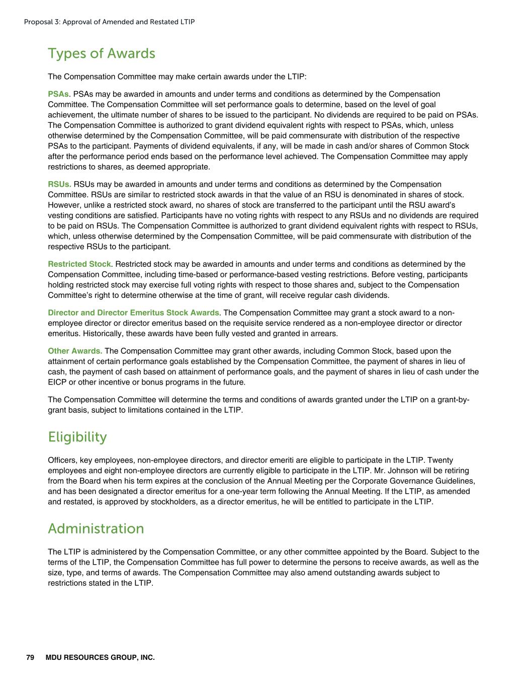 Types of Awards The Compensation Committee may make certain awards under the LTIP: PSAs. PSAs may be awarded in amounts and under terms and conditions as determined by the Compensation Committee. The Compensation Committee will set performance goals to determine, based on the level of goal achievement, the ultimate number of shares to be issued to the participant. No dividends are required to be paid on PSAs. The Compensation Committee is authorized to grant dividend equivalent rights with respect to PSAs, which, unless otherwise determined by the Compensation Committee, will be paid commensurate with distribution of the respective PSAs to the participant. Payments of dividend equivalents, if any, will be made in cash and/or shares of Common Stock after the performance period ends based on the performance level achieved. The Compensation Committee may apply restrictions to shares, as deemed appropriate. RSUs. RSUs may be awarded in amounts and under terms and conditions as determined by the Compensation Committee. RSUs are similar to restricted stock awards in that the value of an RSU is denominated in shares of stock. However, unlike a restricted stock award, no shares of stock are transferred to the participant until the RSU award’s vesting conditions are satisfied. Participants have no voting rights with respect to any RSUs and no dividends are required to be paid on RSUs. The Compensation Committee is authorized to grant dividend equivalent rights with respect to RSUs, which, unless otherwise determined by the Compensation Committee, will be paid commensurate with distribution of the respective RSUs to the participant. Restricted Stock. Restricted stock may be awarded in amounts and under terms and conditions as determined by the Compensation Committee, including time-based or performance-based vesting restrictions. Before vesting, participants holding restricted stock may exercise full voting rights with respect to those shares and, subject to the Compensation Committee’s right to determine otherwise at the time of grant, will receive regular cash dividends. Director and Director Emeritus Stock Awards. The Compensation Committee may grant a stock award to a non- employee director or director emeritus based on the requisite service rendered as a non-employee director or director emeritus. Historically, these awards have been fully vested and granted in arrears. Other Awards. The Compensation Committee may grant other awards, including Common Stock, based upon the attainment of certain performance goals established by the Compensation Committee, the payment of shares in lieu of cash, the payment of cash based on attainment of performance goals, and the payment of shares in lieu of cash under the EICP or other incentive or bonus programs in the future. The Compensation Committee will determine the terms and conditions of awards granted under the LTIP on a grant-by- grant basis, subject to limitations contained in the LTIP. Eligibility Officers, key employees, non-employee directors, and director emeriti are eligible to participate in the LTIP. Twenty employees and eight non-employee directors are currently eligible to participate in the LTIP. Mr. Johnson will be retiring from the Board when his term expires at the conclusion of the Annual Meeting per the Corporate Governance Guidelines, and has been designated a director emeritus for a one-year term following the Annual Meeting. If the LTIP, as amended and restated, is approved by stockholders, as a director emeritus, he will be entitled to participate in the LTIP. Administration The LTIP is administered by the Compensation Committee, or any other committee appointed by the Board. Subject to the terms of the LTIP, the Compensation Committee has full power to determine the persons to receive awards, as well as the size, type, and terms of awards. The Compensation Committee may also amend outstanding awards subject to restrictions stated in the LTIP. Proposal 3: Approval of Amended and Restated LTIP 79 MDU RESOURCES GROUP, INC.