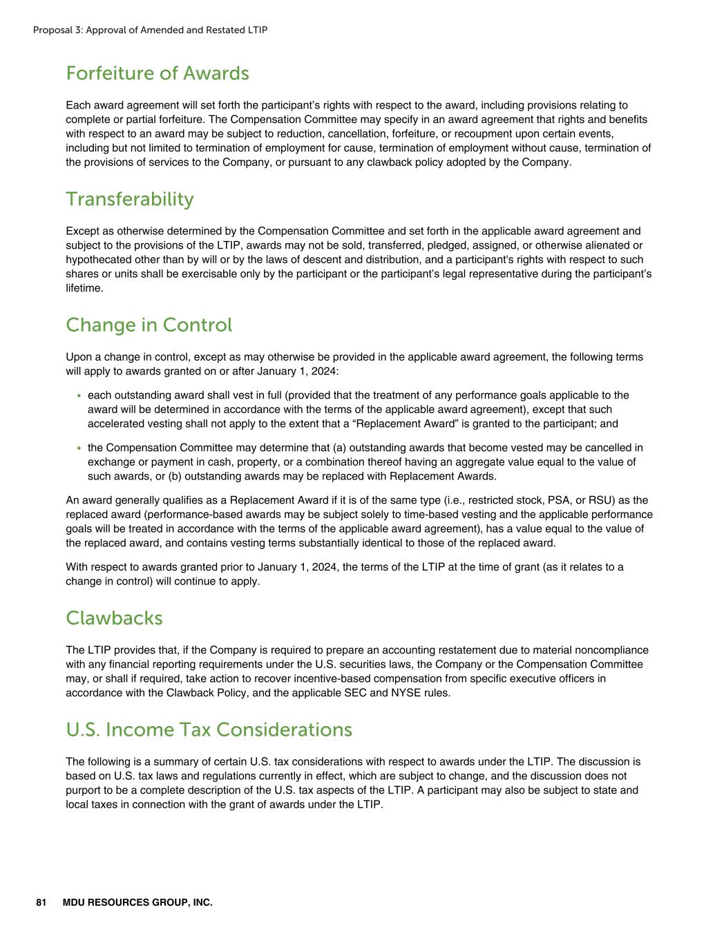Forfeiture of Awards Each award agreement will set forth the participant’s rights with respect to the award, including provisions relating to complete or partial forfeiture. The Compensation Committee may specify in an award agreement that rights and benefits with respect to an award may be subject to reduction, cancellation, forfeiture, or recoupment upon certain events, including but not limited to termination of employment for cause, termination of employment without cause, termination of the provisions of services to the Company, or pursuant to any clawback policy adopted by the Company. Transferability Except as otherwise determined by the Compensation Committee and set forth in the applicable award agreement and subject to the provisions of the LTIP, awards may not be sold, transferred, pledged, assigned, or otherwise alienated or hypothecated other than by will or by the laws of descent and distribution, and a participant's rights with respect to such shares or units shall be exercisable only by the participant or the participant’s legal representative during the participant’s lifetime. Change in Control Upon a change in control, except as may otherwise be provided in the applicable award agreement, the following terms will apply to awards granted on or after January 1, 2024: • each outstanding award shall vest in full (provided that the treatment of any performance goals applicable to the award will be determined in accordance with the terms of the applicable award agreement), except that such accelerated vesting shall not apply to the extent that a “Replacement Award” is granted to the participant; and • the Compensation Committee may determine that (a) outstanding awards that become vested may be cancelled in exchange or payment in cash, property, or a combination thereof having an aggregate value equal to the value of such awards, or (b) outstanding awards may be replaced with Replacement Awards. An award generally qualifies as a Replacement Award if it is of the same type (i.e., restricted stock, PSA, or RSU) as the replaced award (performance-based awards may be subject solely to time-based vesting and the applicable performance goals will be treated in accordance with the terms of the applicable award agreement), has a value equal to the value of the replaced award, and contains vesting terms substantially identical to those of the replaced award. With respect to awards granted prior to January 1, 2024, the terms of the LTIP at the time of grant (as it relates to a change in control) will continue to apply. Clawbacks The LTIP provides that, if the Company is required to prepare an accounting restatement due to material noncompliance with any financial reporting requirements under the U.S. securities laws, the Company or the Compensation Committee may, or shall if required, take action to recover incentive-based compensation from specific executive officers in accordance with the Clawback Policy, and the applicable SEC and NYSE rules. U.S. Income Tax Considerations The following is a summary of certain U.S. tax considerations with respect to awards under the LTIP. The discussion is based on U.S. tax laws and regulations currently in effect, which are subject to change, and the discussion does not purport to be a complete description of the U.S. tax aspects of the LTIP. A participant may also be subject to state and local taxes in connection with the grant of awards under the LTIP. Proposal 3: Approval of Amended and Restated LTIP 81 MDU RESOURCES GROUP, INC.