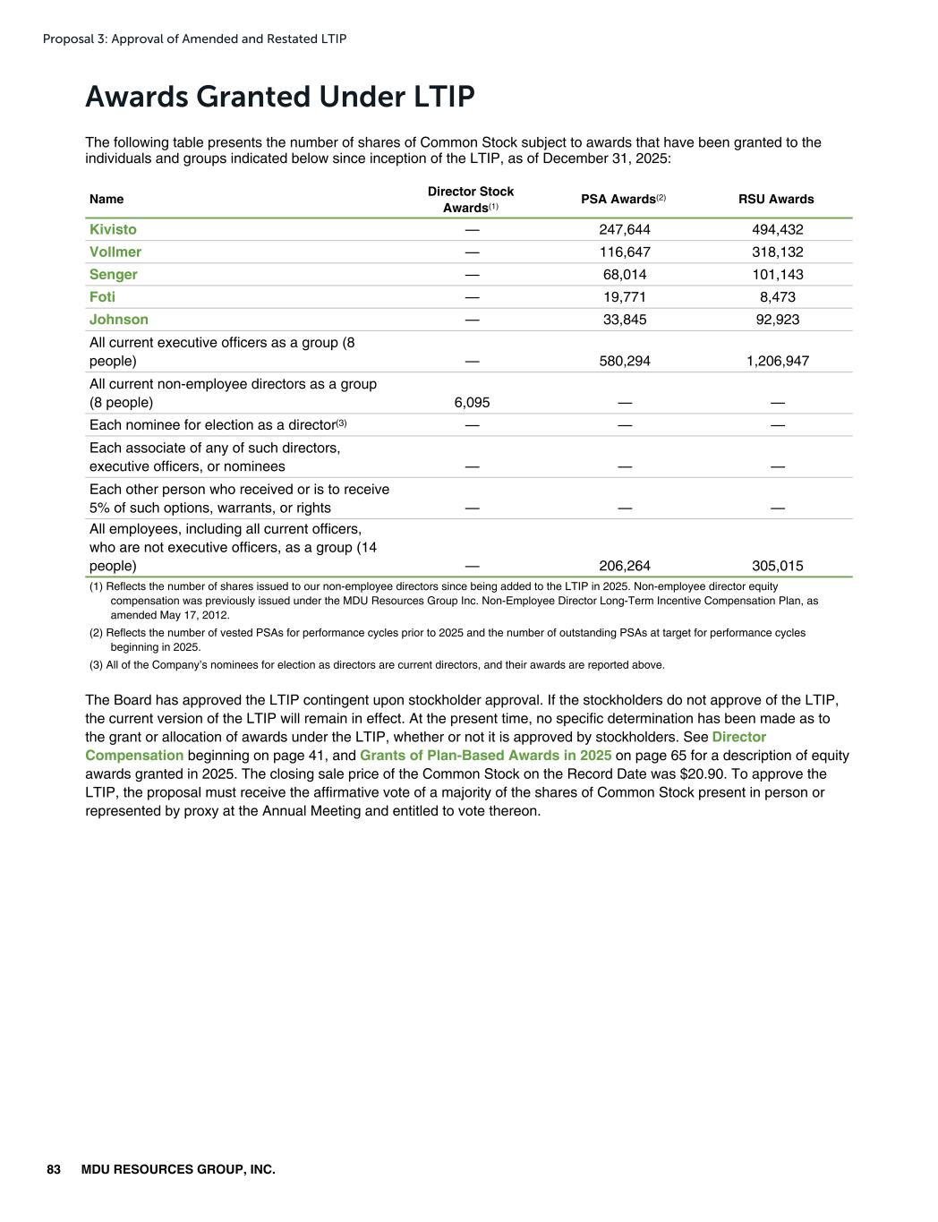 Awards Granted Under LTIP The following table presents the number of shares of Common Stock subject to awards that have been granted to the individuals and groups indicated below since inception of the LTIP, as of December 31, 2025: Name Director Stock Awards(1) PSA Awards(2) RSU Awards Kivisto — 247,644 494,432 Vollmer — 116,647 318,132 Senger — 68,014 101,143 Foti — 19,771 8,473 Johnson — 33,845 92,923 All current executive officers as a group (8 people) — 580,294 1,206,947 All current non-employee directors as a group (8 people) 6,095 — — Each nominee for election as a director(3) — — — Each associate of any of such directors, executive officers, or nominees — — — Each other person who received or is to receive 5% of such options, warrants, or rights — — — All employees, including all current officers, who are not executive officers, as a group (14 people) — 206,264 305,015 (1) Reflects the number of shares issued to our non-employee directors since being added to the LTIP in 2025. Non-employee director equity compensation was previously issued under the MDU Resources Group Inc. Non-Employee Director Long-Term Incentive Compensation Plan, as amended May 17, 2012. (2) Reflects the number of vested PSAs for performance cycles prior to 2025 and the number of outstanding PSAs at target for performance cycles beginning in 2025. (3) All of the Company’s nominees for election as directors are current directors, and their awards are reported above. The Board has approved the LTIP contingent upon stockholder approval. If the stockholders do not approve of the LTIP, the current version of the LTIP will remain in effect. At the present time, no specific determination has been made as to the grant or allocation of awards under the LTIP, whether or not it is approved by stockholders. See Director Compensation beginning on page 41, and Grants of Plan-Based Awards in 2025 on page 65 for a description of equity awards granted in 2025. The closing sale price of the Common Stock on the Record Date was $20.90. To approve the LTIP, the proposal must receive the affirmative vote of a majority of the shares of Common Stock present in person or represented by proxy at the Annual Meeting and entitled to vote thereon. Proposal 3: Approval of Amended and Restated LTIP 83 MDU RESOURCES GROUP, INC.