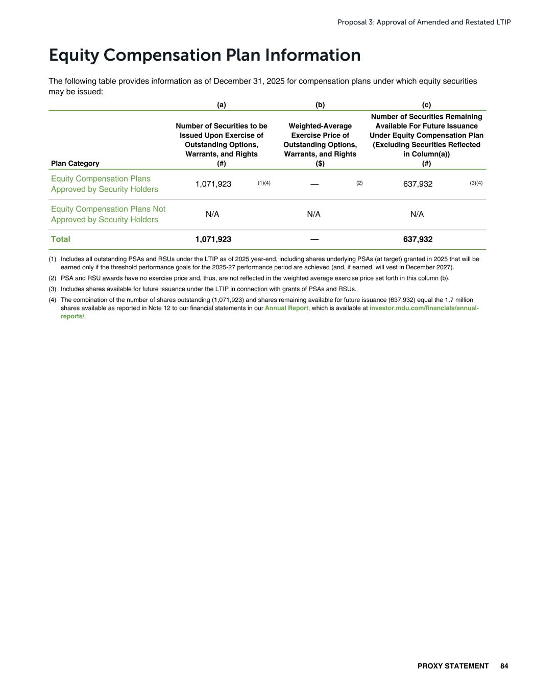 Equity Compensation Plan Information The following table provides information as of December 31, 2025 for compensation plans under which equity securities may be issued: (a) (b) (c) Plan Category Number of Securities to be Issued Upon Exercise of Outstanding Options, Warrants, and Rights (#) Weighted-Average Exercise Price of Outstanding Options, Warrants, and Rights ($) Number of Securities Remaining Available For Future Issuance Under Equity Compensation Plan (Excluding Securities Reflected in Column(a)) (#) Equity Compensation Plans Approved by Security Holders 1,071,923 (1)(4) — (2) 637,932 (3)(4) Equity Compensation Plans Not Approved by Security Holders N/A N/A N/A Total 1,071,923 — 637,932 (1) Includes all outstanding PSAs and RSUs under the LTIP as of 2025 year-end, including shares underlying PSAs (at target) granted in 2025 that will be earned only if the threshold performance goals for the 2025-27 performance period are achieved (and, if earned, will vest in December 2027). (2) PSA and RSU awards have no exercise price and, thus, are not reflected in the weighted average exercise price set forth in this column (b). (3) Includes shares available for future issuance under the LTIP in connection with grants of PSAs and RSUs. (4) The combination of the number of shares outstanding (1,071,923) and shares remaining available for future issuance (637,932) equal the 1.7 million shares available as reported in Note 12 to our financial statements in our Annual Report, which is available at investor.mdu.com/financials/annual- reports/. Proposal 3: Approval of Amended and Restated LTIP PROXY STATEMENT 84