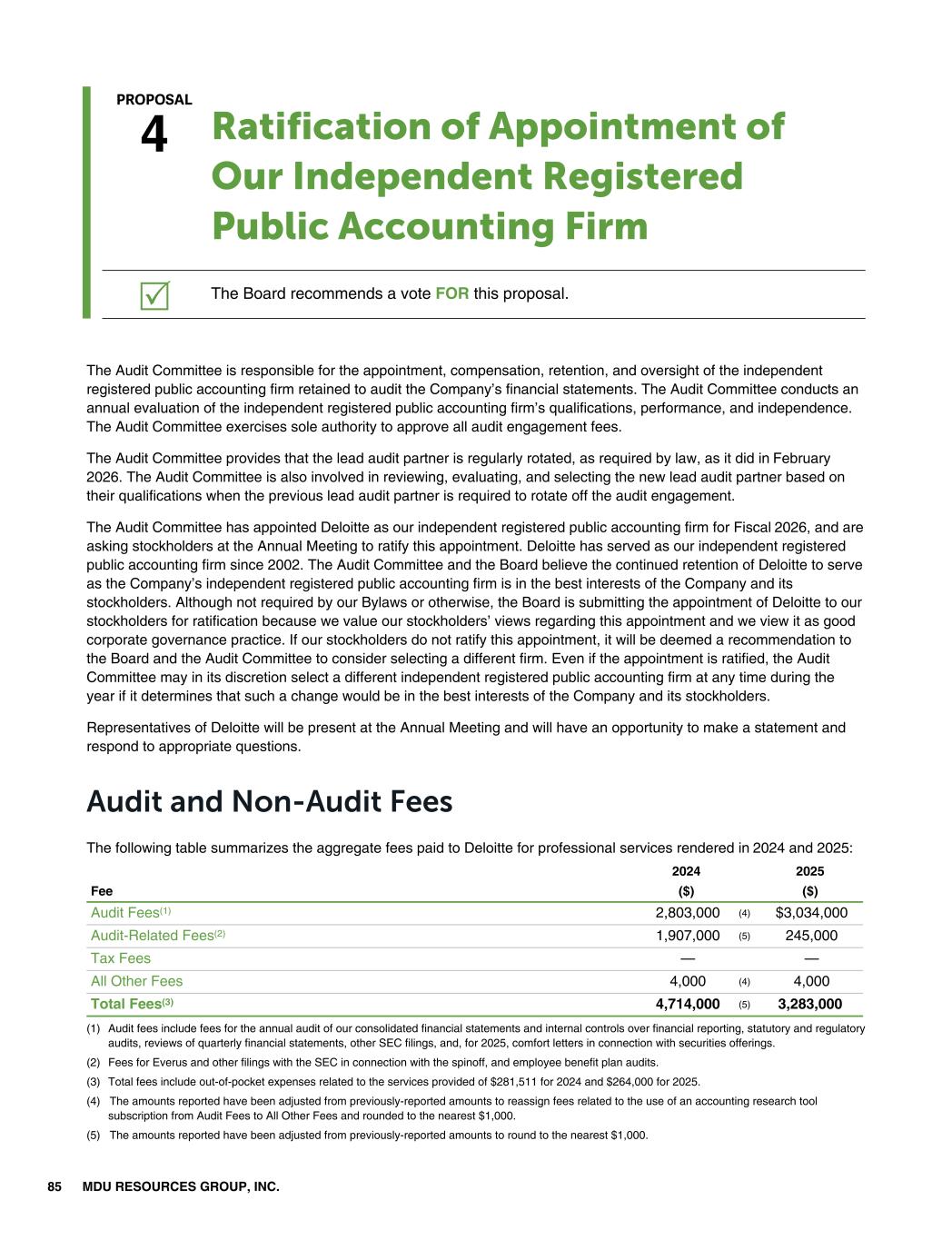PROPOSAL Ratification of Appointment of Our Independent Registered Public Accounting Firm 4 R The Board recommends a vote FOR this proposal. The Audit Committee is responsible for the appointment, compensation, retention, and oversight of the independent registered public accounting firm retained to audit the Company’s financial statements. The Audit Committee conducts an annual evaluation of the independent registered public accounting firm’s qualifications, performance, and independence. The Audit Committee exercises sole authority to approve all audit engagement fees. The Audit Committee provides that the lead audit partner is regularly rotated, as required by law, as it did in February 2026. The Audit Committee is also involved in reviewing, evaluating, and selecting the new lead audit partner based on their qualifications when the previous lead audit partner is required to rotate off the audit engagement. The Audit Committee has appointed Deloitte as our independent registered public accounting firm for Fiscal 2026, and are asking stockholders at the Annual Meeting to ratify this appointment. Deloitte has served as our independent registered public accounting firm since 2002. The Audit Committee and the Board believe the continued retention of Deloitte to serve as the Company’s independent registered public accounting firm is in the best interests of the Company and its stockholders. Although not required by our Bylaws or otherwise, the Board is submitting the appointment of Deloitte to our stockholders for ratification because we value our stockholders’ views regarding this appointment and we view it as good corporate governance practice. If our stockholders do not ratify this appointment, it will be deemed a recommendation to the Board and the Audit Committee to consider selecting a different firm. Even if the appointment is ratified, the Audit Committee may in its discretion select a different independent registered public accounting firm at any time during the year if it determines that such a change would be in the best interests of the Company and its stockholders. Representatives of Deloitte will be present at the Annual Meeting and will have an opportunity to make a statement and respond to appropriate questions. Audit and Non-Audit Fees The following table summarizes the aggregate fees paid to Deloitte for professional services rendered in 2024 and 2025: 2024 2025 Fee ($) ($) Audit Fees(1) 2,803,000 (4) $3,034,000 Audit-Related Fees(2) 1,907,000 (5) 245,000 Tax Fees — — All Other Fees 4,000 (4) 4,000 Total Fees(3) 4,714,000 (5) 3,283,000 (1) Audit fees include fees for the annual audit of our consolidated financial statements and internal controls over financial reporting, statutory and regulatory audits, reviews of quarterly financial statements, other SEC filings, and, for 2025, comfort letters in connection with securities offerings. (2) Fees for Everus and other filings with the SEC in connection with the spinoff, and employee benefit plan audits. (3) Total fees include out-of-pocket expenses related to the services provided of $281,511 for 2024 and $264,000 for 2025. (4) The amounts reported have been adjusted from previously-reported amounts to reassign fees related to the use of an accounting research tool subscription from Audit Fees to All Other Fees and rounded to the nearest $1,000. (5) The amounts reported have been adjusted from previously-reported amounts to round to the nearest $1,000. 85 MDU RESOURCES GROUP, INC.