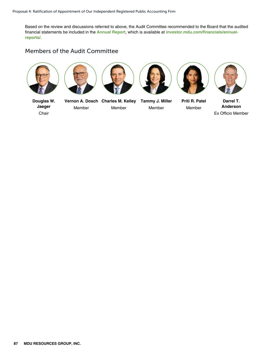 Based on the review and discussions referred to above, the Audit Committee recommended to the Board that the audited financial statements be included in the Annual Report, which is available at investor.mdu.com/financials/annual- reports/. Members of the Audit Committee Douglas W. Jaeger Chair Vernon A. Dosch Member Charles M. Kelley Member Tammy J. Miller Member Priti R. Patel Member Darrel T. Anderson Ex Officio Member Proposal 4: Ratification of Appointment of Our Independent Registered Public Accounting Firm 87 MDU RESOURCES GROUP, INC.