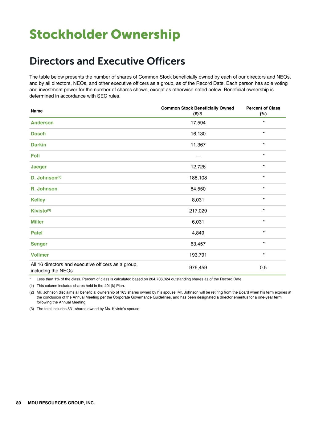 Stockholder Ownership Directors and Executive Officers The table below presents the number of shares of Common Stock beneficially owned by each of our directors and NEOs, and by all directors, NEOs, and other executive officers as a group, as of the Record Date. Each person has sole voting and investment power for the number of shares shown, except as otherwise noted below. Beneficial ownership is determined in accordance with SEC rules. Name Common Stock Beneficially Owned (#)(1) Percent of Class (%) Anderson 17,594 * Dosch 16,130 * Durkin 11,367 * Foti — * Jaeger 12,726 * D. Johnson(2) 188,108 * R. Johnson 84,550 * Kelley 8,031 * Kivisto(3) 217,029 * Miller 6,031 * Patel 4,849 * Senger 63,457 * Vollmer 193,791 * All 16 directors and executive officers as a group, including the NEOs 976,459 0.5 * Less than 1% of the class. Percent of class is calculated based on 204,706,024 outstanding shares as of the Record Date. (1) This column includes shares held in the 401(k) Plan. (2) Mr. Johnson disclaims all beneficial ownership of 163 shares owned by his spouse. Mr. Johnson will be retiring from the Board when his term expires at the conclusion of the Annual Meeting per the Corporate Governance Guidelines, and has been designated a director emeritus for a one-year term following the Annual Meeting. (3) The total includes 531 shares owned by Ms. Kivisto’s spouse. 89 MDU RESOURCES GROUP, INC.