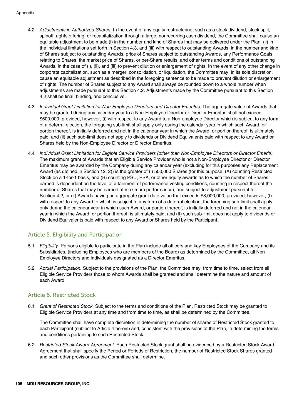 4.2 Adjustments in Authorized Shares. In the event of any equity restructuring, such as a stock dividend, stock split, spinoff, rights offering, or recapitalization through a large, nonrecurring cash dividend, the Committee shall cause an equitable adjustment to be made (i) in the number and kind of Shares that may be delivered under the Plan, (ii) in the individual limitations set forth in Section 4.3, and (iii) with respect to outstanding Awards, in the number and kind of Shares subject to outstanding Awards, price of Shares subject to outstanding Awards, any Performance Goals relating to Shares, the market price of Shares, or per-Share results, and other terms and conditions of outstanding Awards, in the case of (i), (ii), and (iii) to prevent dilution or enlargement of rights. In the event of any other change in corporate capitalization, such as a merger, consolidation, or liquidation, the Committee may, in its sole discretion, cause an equitable adjustment as described in the foregoing sentence to be made to prevent dilution or enlargement of rights. The number of Shares subject to any Award shall always be rounded down to a whole number when adjustments are made pursuant to this Section 4.2. Adjustments made by the Committee pursuant to this Section 4.2 shall be final, binding, and conclusive. 4.3 Individual Grant Limitation for Non-Employee Directors and Director Emeritus. The aggregate value of Awards that may be granted during any calendar year to a Non-Employee Director or Director Emeritus shall not exceed $600,000; provided, however, (i) with respect to any Award to a Non-employee Director which is subject to any form of a deferral election, the foregoing sub-limit shall apply only during the calendar year in which such Award, or portion thereof, is initially deferred and not in the calendar year in which the Award, or portion thereof, is ultimately paid, and (ii) such sub-limit does not apply to dividends or Dividend Equivalents paid with respect to any Award or Shares held by the Non-Employee Director or Director Emeritus. 4.4 Individual Grant Limitation for Eligible Service Providers (other than Non-Employee Directors or Director Emeriti). The maximum grant of Awards that an Eligible Service Provider who is not a Non-Employee Director or Director Emeritus may be awarded by the Company during any calendar year (excluding for this purposes any Replacement Award (as defined in Section 12. 2)) is the greater of (i) 500,000 Shares (for this purpose, (A) counting Restricted Stock on a 1-for-1 basis, and (B) counting PSU, PSA, or other equity awards as to which the number of Shares earned is dependent on the level of attainment of performance vesting conditions, counting in respect thereof the number of Shares that may be earned at maximum performance), and subject to adjustment pursuant to Section 4.2, or (ii) Awards having an aggregate grant date value that exceeds $8,000,000; provided, however, (I) with respect to any Award to which is subject to any form of a deferral election, the foregoing sub-limit shall apply only during the calendar year in which such Award, or portion thereof, is initially deferred and not in the calendar year in which the Award, or portion thereof, is ultimately paid, and (II) such sub-limit does not apply to dividends or Dividend Equivalents paid with respect to any Award or Shares held by the Participant. Article 5. Eligibility and Participation 5.1 Eligibility. Persons eligible to participate in the Plan include all officers and key Employees of the Company and its Subsidiaries, (including Employees who are members of the Board) as determined by the Committee, all Non- Employee Directors and individuals designated as a Director Emeritus. 5.2 Actual Participation. Subject to the provisions of the Plan, the Committee may, from time to time, select from all Eligible Service Providers those to whom Awards shall be granted and shall determine the nature and amount of each Award. Article 6. Restricted Stock 6.1 Grant of Restricted Stock. Subject to the terms and conditions of the Plan, Restricted Stock may be granted to Eligible Service Providers at any time and from time to time, as shall be determined by the Committee. The Committee shall have complete discretion in determining the number of shares of Restricted Stock granted to each Participant (subject to Article 4 herein) and, consistent with the provisions of the Plan, in determining the terms and conditions pertaining to such Restricted Stock. 6.2 Restricted Stock Award Agreement. Each Restricted Stock grant shall be evidenced by a Restricted Stock Award Agreement that shall specify the Period or Periods of Restriction, the number of Restricted Stock Shares granted and such other provisions as the Committee shall determine. Appendix 105 MDU RESOURCES GROUP, INC.