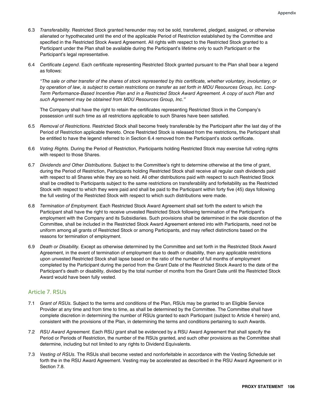 6.3 Transferability. Restricted Stock granted hereunder may not be sold, transferred, pledged, assigned, or otherwise alienated or hypothecated until the end of the applicable Period of Restriction established by the Committee and specified in the Restricted Stock Award Agreement. All rights with respect to the Restricted Stock granted to a Participant under the Plan shall be available during the Participant’s lifetime only to such Participant or the Participant’s legal representative. 6.4 Certificate Legend. Each certificate representing Restricted Stock granted pursuant to the Plan shall bear a legend as follows: “The sale or other transfer of the shares of stock represented by this certificate, whether voluntary, involuntary, or by operation of law, is subject to certain restrictions on transfer as set forth in MDU Resources Group, Inc. Long- Term Performance-Based Incentive Plan and in a Restricted Stock Award Agreement. A copy of such Plan and such Agreement may be obtained from MDU Resources Group, Inc.” The Company shall have the right to retain the certificates representing Restricted Stock in the Company’s possession until such time as all restrictions applicable to such Shares have been satisfied. 6.5 Removal of Restrictions. Restricted Stock shall become freely transferable by the Participant after the last day of the Period of Restriction applicable thereto. Once Restricted Stock is released from the restrictions, the Participant shall be entitled to have the legend referred to in Section 6.4 removed from the Participant’s stock certificate. 6.6 Voting Rights. During the Period of Restriction, Participants holding Restricted Stock may exercise full voting rights with respect to those Shares. 6.7 Dividends and Other Distributions. Subject to the Committee’s right to determine otherwise at the time of grant, during the Period of Restriction, Participants holding Restricted Stock shall receive all regular cash dividends paid with respect to all Shares while they are so held. All other distributions paid with respect to such Restricted Stock shall be credited to Participants subject to the same restrictions on transferability and forfeitability as the Restricted Stock with respect to which they were paid and shall be paid to the Participant within forty five (45) days following the full vesting of the Restricted Stock with respect to which such distributions were made. 6.8 Termination of Employment. Each Restricted Stock Award Agreement shall set forth the extent to which the Participant shall have the right to receive unvested Restricted Stock following termination of the Participant’s employment with the Company and its Subsidiaries. Such provisions shall be determined in the sole discretion of the Committee, shall be included in the Restricted Stock Award Agreement entered into with Participants, need not be uniform among all grants of Restricted Stock or among Participants, and may reflect distinctions based on the reasons for termination of employment. 6.9 Death or Disability. Except as otherwise determined by the Committee and set forth in the Restricted Stock Award Agreement, in the event of termination of employment due to death or disability, then any applicable restrictions upon unvested Restricted Stock shall lapse based on the ratio of the number of full months of employment completed by the Participant during the period from the Grant Date of the Restricted Stock Award to the date of the Participant’s death or disability, divided by the total number of months from the Grant Date until the Restricted Stock Award would have been fully vested. Article 7. RSUs 7.1 Grant of RSUs. Subject to the terms and conditions of the Plan, RSUs may be granted to an Eligible Service Provider at any time and from time to time, as shall be determined by the Committee. The Committee shall have complete discretion in determining the number of RSUs granted to each Participant (subject to Article 4 herein) and, consistent with the provisions of the Plan, in determining the terms and conditions pertaining to such Awards. 7.2 RSU Award Agreement. Each RSU grant shall be evidenced by a RSU Award Agreement that shall specify the Period or Periods of Restriction, the number of the RSUs granted, and such other provisions as the Committee shall determine, including but not limited to any rights to Dividend Equivalents. 7.3 Vesting of RSUs. The RSUs shall become vested and nonforfeitable in accordance with the Vesting Schedule set forth the in the RSU Award Agreement. Vesting may be accelerated as described in the RSU Award Agreement or in Section 7.8. Appendix PROXY STATEMENT 106