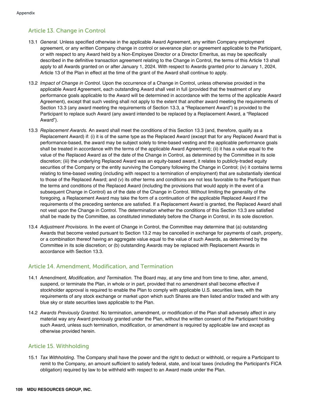 Article 13. Change in Control 13.1 General. Unless specified otherwise in the applicable Award Agreement, any written Company employment agreement, or any written Company change in control or severance plan or agreement applicable to the Participant, or with respect to any Award held by a Non-Employee Director or a Director Emeritus, as may be specifically described in the definitive transaction agreement relating to the Change in Control, the terms of this Article 13 shall apply to all Awards granted on or after January 1, 2024. With respect to Awards granted prior to January 1, 2024, Article 13 of the Plan in effect at the time of the grant of the Award shall continue to apply. 13.2 Impact of Change in Control. Upon the occurrence of a Change in Control, unless otherwise provided in the applicable Award Agreement, each outstanding Award shall vest in full (provided that the treatment of any performance goals applicable to the Award will be determined in accordance with the terms of the applicable Award Agreement), except that such vesting shall not apply to the extent that another award meeting the requirements of Section 13.3 (any award meeting the requirements of Section 13.3, a “Replacement Award”) is provided to the Participant to replace such Award (any award intended to be replaced by a Replacement Award, a “Replaced Award”). 13.3 Replacement Awards. An award shall meet the conditions of this Section 13.3 (and, therefore, qualify as a Replacement Award) if: (i) it is of the same type as the Replaced Award (except that for any Replaced Award that is performance-based, the award may be subject solely to time-based vesting and the applicable performance goals shall be treated in accordance with the terms of the applicable Award Agreement); (ii) it has a value equal to the value of the Replaced Award as of the date of the Change in Control, as determined by the Committee in its sole discretion; (iii) the underlying Replaced Award was an equity-based award, it relates to publicly-traded equity securities of the Company or the entity surviving the Company following the Change in Control; (iv) it contains terms relating to time-based vesting (including with respect to a termination of employment) that are substantially identical to those of the Replaced Award; and (v) its other terms and conditions are not less favorable to the Participant than the terms and conditions of the Replaced Award (including the provisions that would apply in the event of a subsequent Change in Control) as of the date of the Change in Control. Without limiting the generality of the foregoing, a Replacement Award may take the form of a continuation of the applicable Replaced Award if the requirements of the preceding sentence are satisfied. If a Replacement Award is granted, the Replaced Award shall not vest upon the Change in Control. The determination whether the conditions of this Section 13.3 are satisfied shall be made by the Committee, as constituted immediately before the Change in Control, in its sole discretion. 13.4 Adjustment Provisions. In the event of Change in Control, the Committee may determine that (a) outstanding Awards that become vested pursuant to Section 13.2 may be cancelled in exchange for payments of cash, property, or a combination thereof having an aggregate value equal to the value of such Awards, as determined by the Committee in its sole discretion; or (b) outstanding Awards may be replaced with Replacement Awards in accordance with Section 13.3. Article 14. Amendment, Modification, and Termination 14.1 Amendment, Modification, and Termination. The Board may, at any time and from time to time, alter, amend, suspend, or terminate the Plan, in whole or in part, provided that no amendment shall become effective if stockholder approval is required to enable the Plan to comply with applicable U.S. securities laws, with the requirements of any stock exchange or market upon which such Shares are then listed and/or traded and with any blue sky or state securities laws applicable to the Plan. 14.2 Awards Previously Granted. No termination, amendment, or modification of the Plan shall adversely affect in any material way any Award previously granted under the Plan, without the written consent of the Participant holding such Award, unless such termination, modification, or amendment is required by applicable law and except as otherwise provided herein. Article 15. Withholding 15.1 Tax Withholding. The Company shall have the power and the right to deduct or withhold, or require a Participant to remit to the Company, an amount sufficient to satisfy federal, state, and local taxes (including the Participant's FICA obligation) required by law to be withheld with respect to an Award made under the Plan. Appendix 109 MDU RESOURCES GROUP, INC.