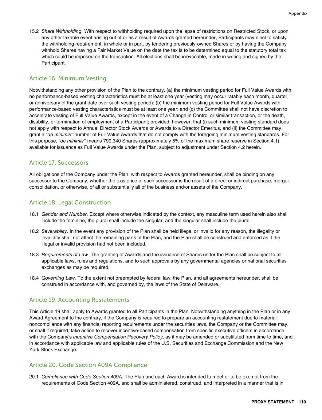 15.2 Share Withholding. With respect to withholding required upon the lapse of restrictions on Restricted Stock, or upon any other taxable event arising out of or as a result of Awards granted hereunder, Participants may elect to satisfy the withholding requirement, in whole or in part, by tendering previously-owned Shares or by having the Company withhold Shares having a Fair Market Value on the date the tax is to be determined equal to the statutory total tax which could be imposed on the transaction. All elections shall be irrevocable, made in writing and signed by the Participant. Article 16. Minimum Vesting Notwithstanding any other provision of the Plan to the contrary, (a) the minimum vesting period for Full Value Awards with no performance-based vesting characteristics must be at least one year (vesting may occur ratably each month, quarter, or anniversary of the grant date over such vesting period); (b) the minimum vesting period for Full Value Awards with performance-based vesting characteristics must be at least one year; and (c) the Committee shall not have discretion to accelerate vesting of Full Value Awards, except in the event of a Change in Control or similar transaction, or the death, disability, or termination of employment of a Participant; provided, however, that (i) such minimum vesting standard does not apply with respect to Annual Director Stock Awards or Awards to a Director Emeritus, and (ii) the Committee may grant a “de minimis” number of Full Value Awards that do not comply with the foregoing minimum vesting standards. For this purpose, “de minimis” means 790,340 Shares (approximately 5% of the maximum share reserve in Section 4.1) available for issuance as Full Value Awards under the Plan, subject to adjustment under Section 4.2 herein. Article 17. Successors All obligations of the Company under the Plan, with respect to Awards granted hereunder, shall be binding on any successor to the Company, whether the existence of such successor is the result of a direct or indirect purchase, merger, consolidation, or otherwise, of all or substantially all of the business and/or assets of the Company. Article 18. Legal Construction 18.1 Gender and Number. Except where otherwise indicated by the context, any masculine term used herein also shall include the feminine, the plural shall include the singular, and the singular shall include the plural. 18.2 Severability. In the event any provision of the Plan shall be held illegal or invalid for any reason, the illegality or invalidity shall not affect the remaining parts of the Plan, and the Plan shall be construed and enforced as if the illegal or invalid provision had not been included. 18.3 Requirements of Law. The granting of Awards and the issuance of Shares under the Plan shall be subject to all applicable laws, rules and regulations, and to such approvals by any governmental agencies or national securities exchanges as may be required. 18.4 Governing Law. To the extent not preempted by federal law, the Plan, and all agreements hereunder, shall be construed in accordance with, and governed by, the laws of the State of Delaware. Article 19. Accounting Restatements This Article 19 shall apply to Awards granted to all Participants in the Plan. Notwithstanding anything in the Plan or in any Award Agreement to the contrary, if the Company is required to prepare an accounting restatement due to material noncompliance with any financial reporting requirements under the securities laws, the Company or the Committee may, or shall if required, take action to recover incentive-based compensation from specific executive officers in accordance with the Company's Incentive Compensation Recovery Policy, as it may be amended or substituted from time to time, and in accordance with applicable law and applicable rules of the U.S. Securities and Exchange Commission and the New York Stock Exchange. Article 20. Code Section 409A Compliance 20.1 Compliance with Code Section 409A. The Plan and each Award is intended to meet or to be exempt from the requirements of Code Section 409A, and shall be administered, construed, and interpreted in a manner that is in Appendix PROXY STATEMENT 110