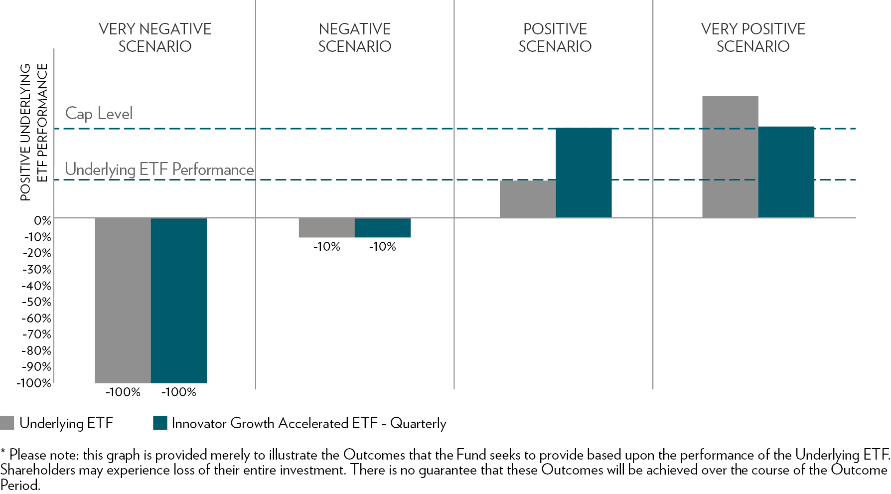 of the Underlying ETF and any gains of the Underlying ETF above the prior Cap will be forfeited. In addition, because the Fund is designed to achieve Outcomes that change for each three-month Outcome Period, the Outcomes that are achieved by the Fund for a three-month Outcome Period will be different than the Outcomes achieved by the Fund over multiple Outcome Periods, or on an annualized basis. Similarly, investors holding Shares over multiple Outcome Periods will experience different investment results than holding a fund that has a longer Outcome Period (e.g., one year) and any losses for such holders could exceed the performance for a fund with a longer Outcome Period.
