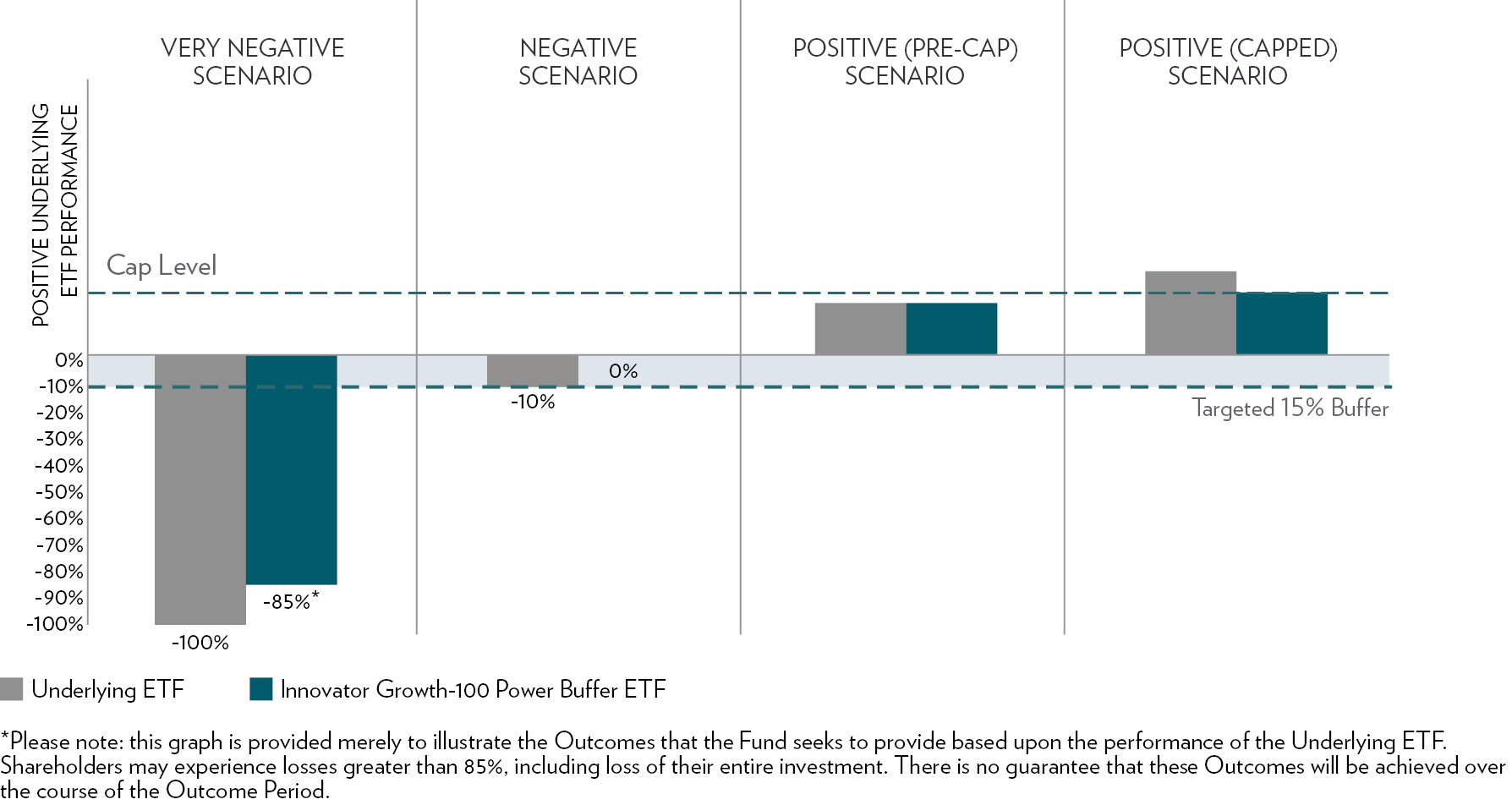 Buffer. The Fund seeks to provide shareholders who hold Shares for the entire Outcome Period with a “power” Buffer against the first 15% of Underlying ETF losses for the Outcome Period; however, there is no guarantee that the Fund will be successful in its attempt to provide buffered returns. After the Underlying ETF’s share price has decreased by more than 15%, the Fund will experience all subsequent losses on a one-to-one basis. The effect sought to be created by the Buffer is that if the Underlying ETF’s share price has decreased in value over the course of the Outcome Period, the Fund seeks to be returned the amount of its principal investment (if the Underlying ETF’s share price decreased in value by 15% or less) or experience a loss that is 15% less than the loss experienced by the Underlying ETF (if the Underlying ETF’s share price decreased in value by more than 15%). A shareholder may lose their entire investment. While the Fund seeks to limit losses to 85% for shareholders who hold Shares for the entire Outcome Period, there is no guarantee it will successfully do so. An investment in the Fund is only appropriate for shareholders willing to bear those losses.