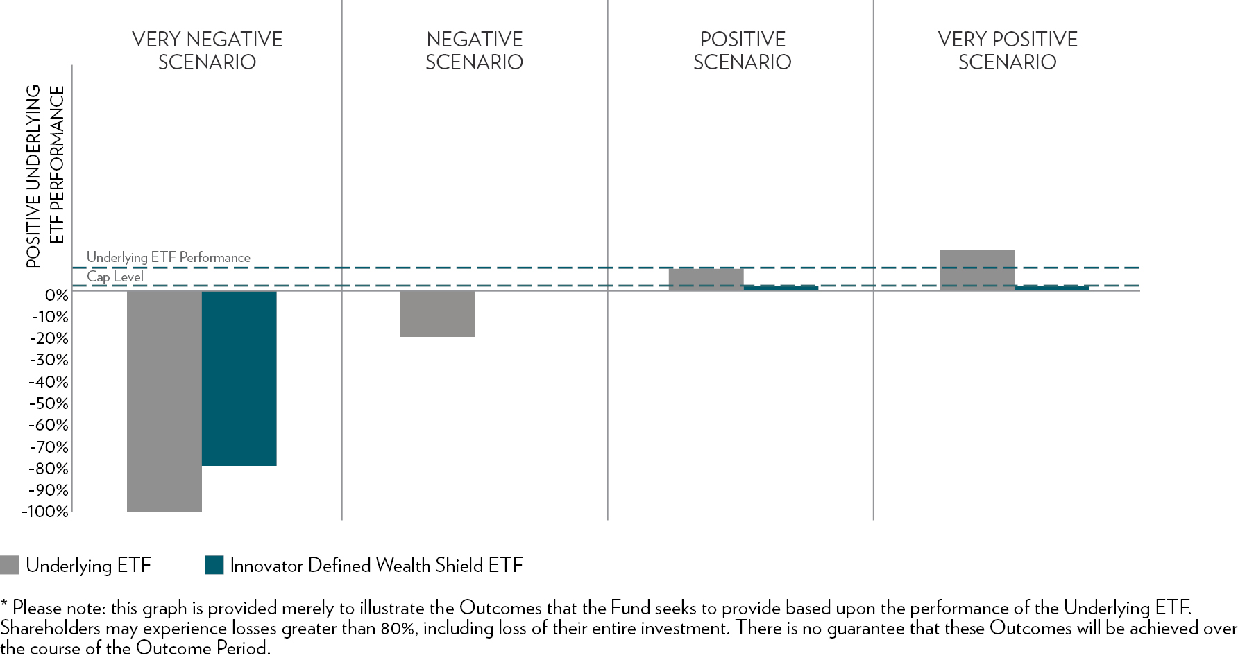 The Fund’s strategy has been specifically designed to produce the “Outcomes” described below based upon the performance of the Underlying ETF over the duration of the Outcome Period. The Fund seeks replicate the performance of the Underlying ETF over the duration of the Outcome Period, subject to the below pre-determined Outcomes. The Fund’s “Defined Wealth Shield” investment strategy seeks to limit downside losses via the operation of the Buffer, while simultaneously generating returns that match the Underlying ETF, up to the Cap. There is no guarantee that the Fund will be successful in its attempt to provide the Outcomes for an Outcome Period.