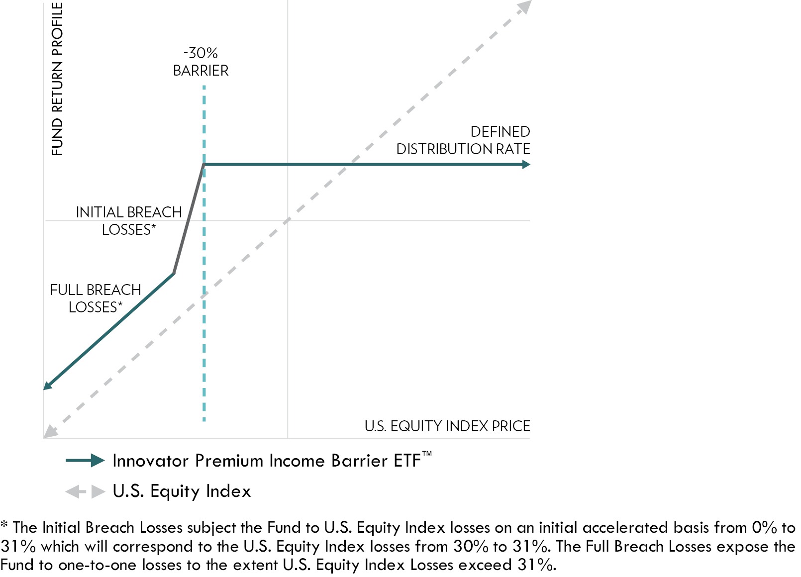 ο If at the conclusion of the Outcome Period the market value of the U.S. Equity Index has decreased in comparison to the market value of the U.S. Equity Index at the beginning of the Outcome Period in an amount that is greater than the Barrier (30%) but less than or equal to 31%, the Fund will be subject to U.S. Equity Index losses on an accelerated basis from 0% to 31%, which will correspond to the U.S. Equity Index losses from 30% to 31% (the “Initial Breach Losses”). See “Principal Investment Strategies — The Barrier — Initial Breach Losses.”