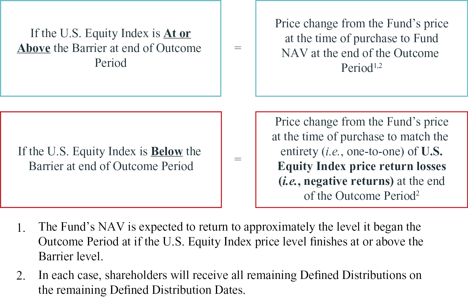 • Outcomes: The pre-determined outcomes sought by the Fund, which include the Defined Distributions and the Barrier (the “Outcomes”) are designed to provide investment performance for each Outcome Period that is equal to the Defined Distribution Rate, less the Initial Breach Losses or Full Breach Losses, as applicable, if the U.S. Equity Index losses exceed the Barrier at the end of the Outcome Period. If at the end of the Outcome Period the U.S. Equity Index has experienced (in comparison to the market value of the U.S. Equity Index at the beginning of the Outcome Period) a positive price return, or price return losses that are less than the Barrier, the Fund is designed to provide investors who hold shares for the entirety of the Outcome Period returns that equal the original NAV at the commencement of the Outcome Period plus the Defined Distribution Rate. Conversely, if the U.S. Equity Index has experienced losses at the end of the Outcome Period that exceed the Barrier (in comparison to the market value of the U.S. Equity Index at the beginning of the Outcome Period), the Fund is designed to provide investors who hold shares for the entirety of the Outcome Period with a NAV that decreases in value equal to the Initial Breach Losses or Full Breach Losses, as applicable, plus the Defined Distribution Rate. The Fund will not receive any of the upside returns of the U.S. Equity Index over the Outcome Period. See “Principal Investment Strategies – Fund Portfolio” and “Principal investment Strategies – The Outcome Period” for additional information. The Fund and the sought-after Outcomes are designed for shareholders who invest and hold Shares from the commencement of the Outcome Period through the end of the Outcome Period.