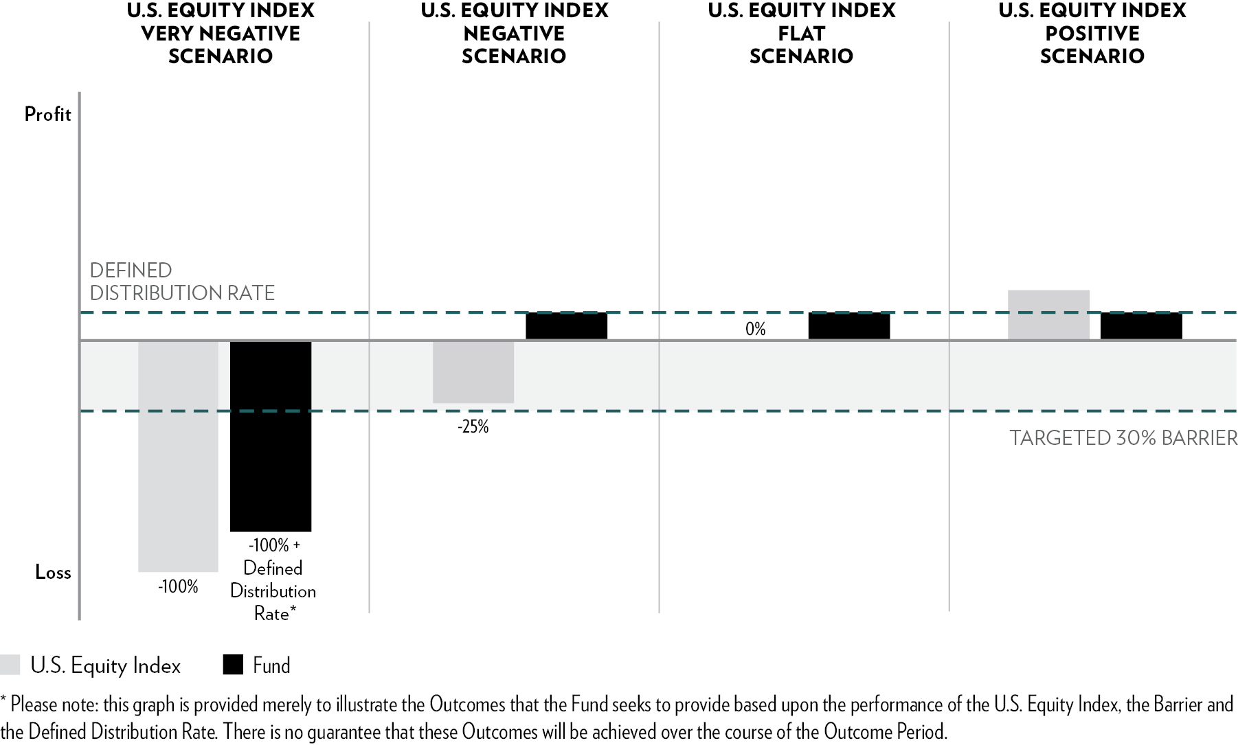 ο Outcomes: The Fund is designed to provide investors with Outcomes for each Outcome Period that is equal to the Defined Distribution Rate, less the losses experienced by the U.S. Equity Index if such losses exceed the Barrier at the end of the Outcome Period. If at the end of the Outcome Period the U.S. Equity Index has experienced a positive price return, or price return losses that are less than the Barrier, the Fund is designed to provide investors who hold shares for the entirety of the Outcome Period returns that equal the original NAV at the commencement of the Outcome Period plus the Defined Distribution Rate. Conversely, if the U.S. Equity Index has experienced losses at the end of the Outcome Period that exceed the Barrier, the Fund is designed to provide investors who hold shares for the entirety of the Outcome Period with a NAV that decreases in value reflecting the losses experienced by the U.S. Equity Index losses, plus the Defined Distribution Rate. The Fund will not receive any of the upside returns of the U.S. Equity Index over each Outcome Period.