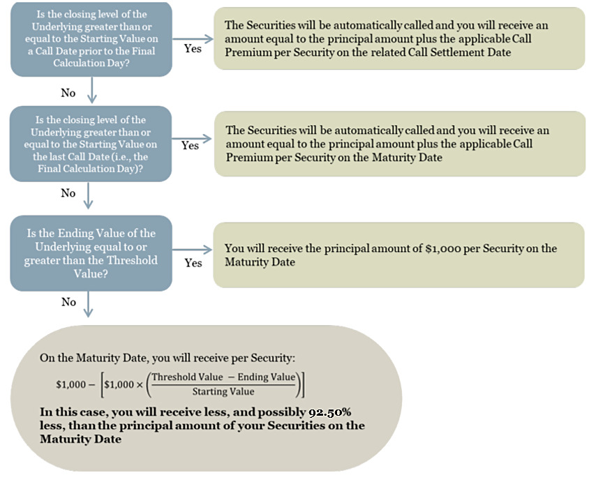 •if the Ending Value is less than the Threshold Value: $1,000 minus: If the Securities are not automatically called and the Ending Value is less than the Threshold Value, you will receive less, and possibly 92.50% less, than the principal amount of your Securities at maturity.