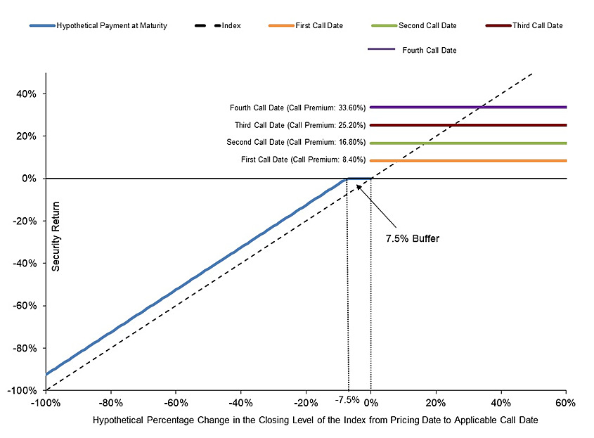 Because the hypothetical closing level of the Underlying on each Call Date (including the Final Calculation Day) is less than the hypothetical Starting Value, the Securities are not automatically called. Because the hypothetical Ending Value is less than the hypothetical Starting Value, but not by more than the buffer amount of 7.50%, you would receive the principal amount of your Securities at maturity.