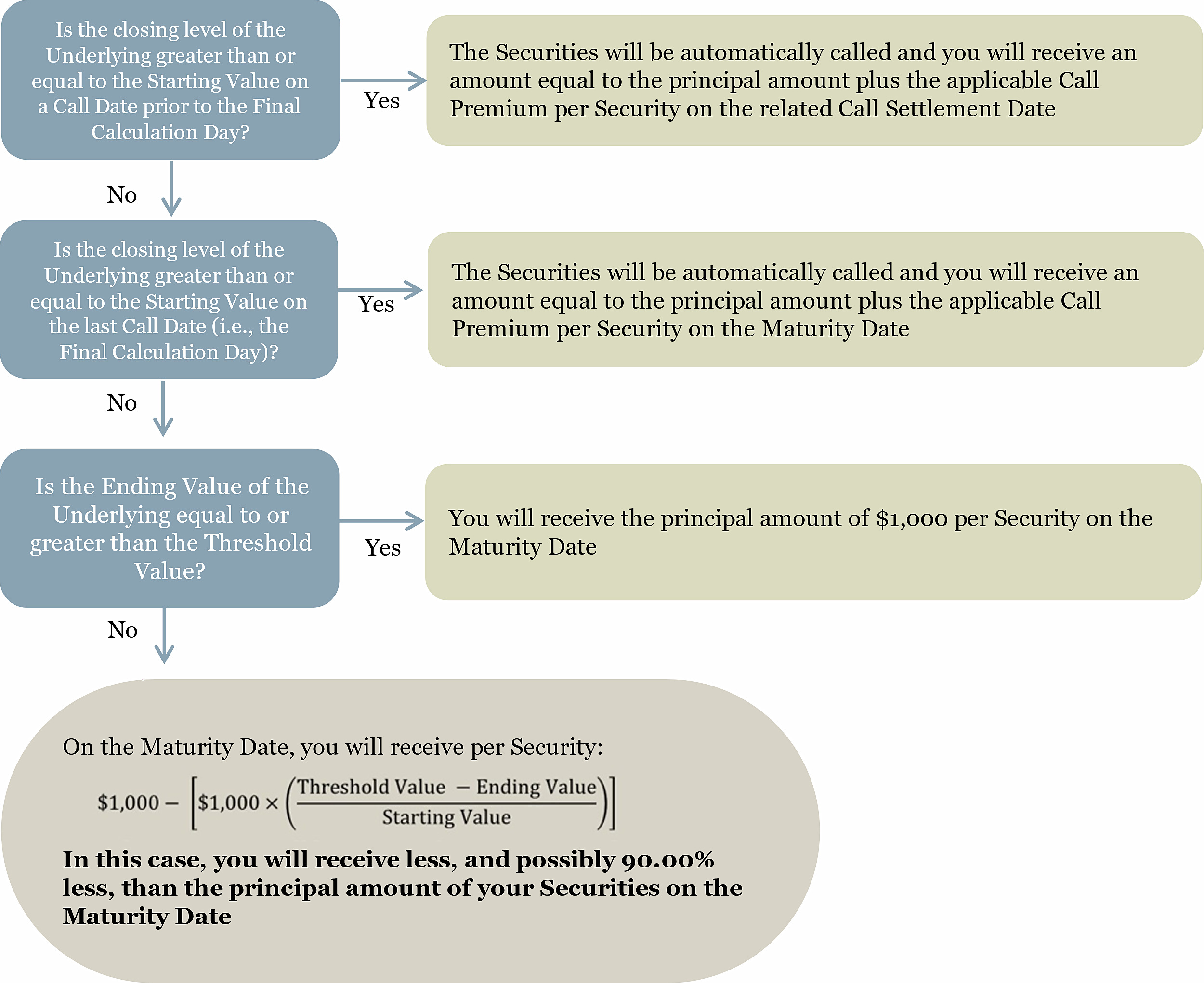 If the Securities are not automatically called and the Ending Value is less than the Threshold Value, you will receive less, and possibly 90.00% less, than the principal amount of your Securities at maturity.