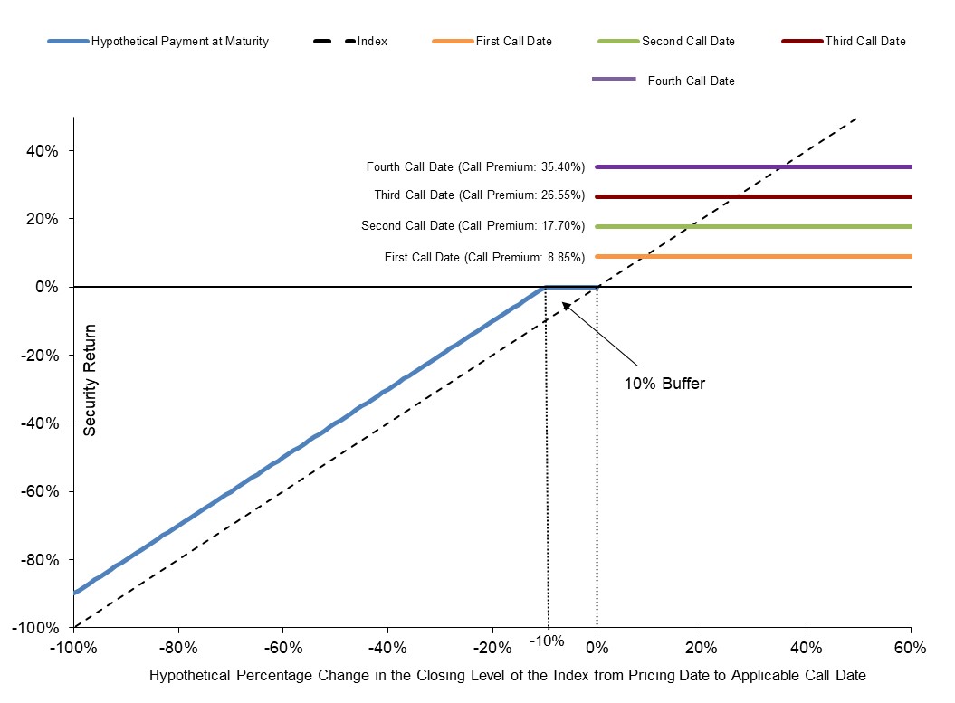 Because the hypothetical closing level of the Underlying on each Call Date (including the Final Calculation Day) is less than the hypothetical Starting Value, the Securities are not automatically called. Because the hypothetical Ending Value is less than the hypothetical Starting Value, but not by more than the buffer amount of 10.00%, you would receive the principal amount of your Securities at maturity.