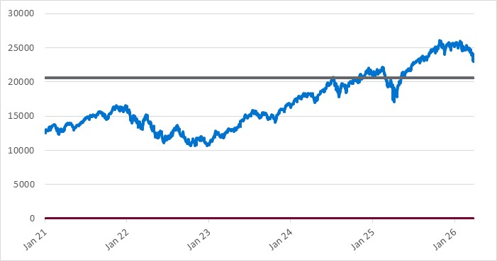 The following graph sets forth the daily historical performance of the NDX in the period from January 2, 2021 through the Pricing Date. We obtained this historical data from Bloomberg L.P. We have not independently verified the accuracy or completeness of the information obtained from Bloomberg L.P. The horizontal line in the graph represents the NDX’s Threshold Value of 20,658.042, which is 90.00% of the NDX’s Starting Value of 22,953.38.
