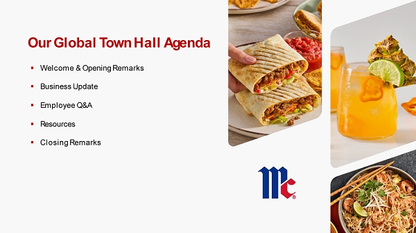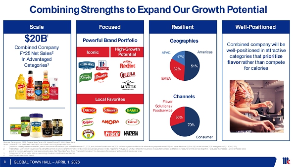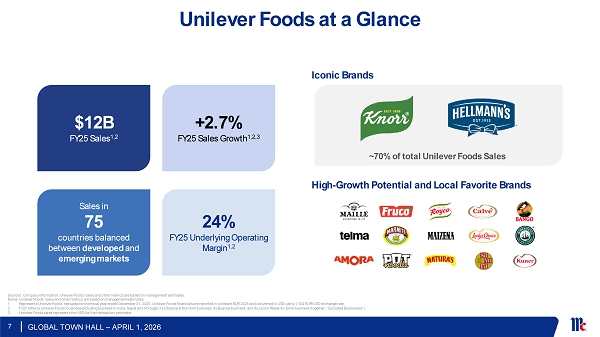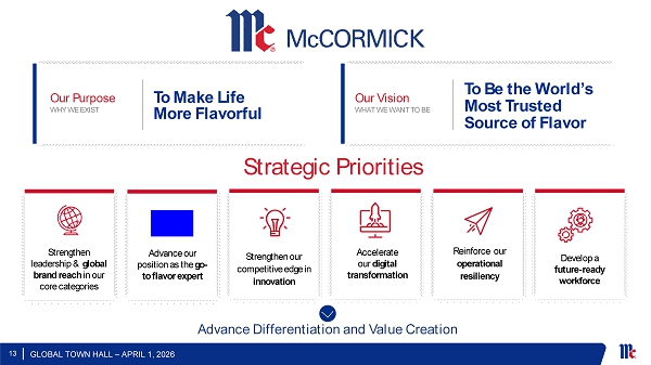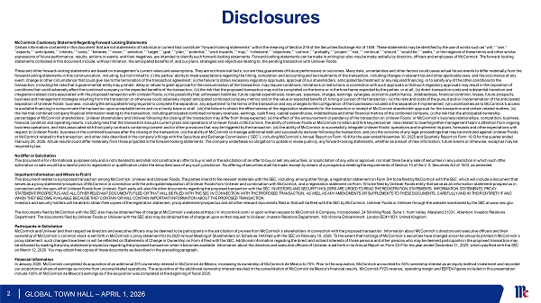 2 2 GLOBAL TOWN HALL – APRIL 1, 2026 Disclosures McCormick Cautionary Statement Regarding Forward Looking Statements Certain information contained in this document that are not statements of historical or current fact constitute “forward - looking statements” within the meaning of Section 21E of the Securities Exchange Act of 1934. These statements may be identified by t he use of words such as “will,” “aim,” “expects,” “anticipates,” “intends,” “looks,” “believes,” “vision,” “ambition,” “target,” “goal,” “plan,” “potential,” “work tow ards,” “may,” “milestone,” “objectives,” “outlook,” “probably,” “project,” “risk,” “continue,” “should,” “would be,” “seeks,” or the negative of these terms and other similar expressions of future performance, results, actions or events, and their negatives, are intended to identify such forward - lookin g statements. Forward - looking statements can be made in writing but also may be made verbally by directors, officers and employe es of McCormick. The forward - looking statements contained in this document include, without limitation, the anticipated benefits of, and our plans, strategies and ob jectives relating to, the pending transaction with Unilever Foods. These and other forward - looking statements are based on management’s current views and assumptions. They are not historical fact s, nor are they guarantees of future performance or outcomes. Many risks, uncertainties and other factors could cause actual fut ure events to differ materially from the forward - looking statements in this communication, including, but not limited to: (i) the parties’ ability to meet expectations r egarding the timing, completion and accounting and tax treatments of the transaction, including changes in relevant tax and o the r applicable laws, and the occurrence of any event, change or other circumstance that could give rise to the termination of the transaction agreement; (ii) the failure to ob tain necessary regulatory approvals, approval of our shareholders, anticipated tax treatment or any required financing, or to sa tisfy any of the other conditions to the transaction, including the risks that a governmental entity may prohibit, delay or refuse to grant approval for the consummat ion of the transaction, may require conditions, limitations or restrictions in connection with such approvals or that such regula to ry approvals may result in the imposition of conditions that could adversely affect the combined company or the expected benefits of the transaction; (iii) the risk that the proposed transaction may not be completed on the terms or in the time frame expected by the parties, or at all; (iv) direct t ra nsaction costs and substantial transition and integration - related costs associated with the proposed transaction with Unilever Foods; (v) the possibility that unforeseen liab ilities, future capital expenditures, revenues, expenses, charges, earnings, synergies, economic performance, indebtedness, f ina ncial condition, losses, future prospects, business and management strategies resulting from the transaction or otherwise could adversely impact anticipated combined co mpa ny metrics and/or the value or expected benefit of, timing or pursuit of the transaction; (vi) the risks and costs of the pur sui t and/or implementation of the anticipated separation of Unilever Foods’ business, including the anticipated timing required to complete the separation, any adjustment to the terms of the transaction and any changes to the configuration of the businesses included in the separation if implemented ; ( vii) uncertainties as to McCormick’s access to available financing to consummate the transaction upon acceptable terms and on a timely basis or at all; (viii) the failur e t o obtain the effectiveness of the registration statements for the transaction or receipt of McCormick shareholder approval fo r t he transaction and certain related matters; (ix) the risk that combined company financial information relating to the transaction, including anticipated combined company reve nue s, earnings, cash flows, capital expenditures, indebtedness and other financial metrics of the combined company; (x) the risk th at the anticipated ownership percentages of McCormick shareholders, Unilever shareholders and Unilever following the closing of the transaction may differ fr om those expected; (xi) the effect of the announcement or pendency of the transaction on Unilever Foods’ or McCormick’s busin ess relationships, competition, business, financial condition and operating results, including risks that the transaction disrupts current plans and operations of Unil eve r Foods or McCormick, the ability of Unilever Foods or McCormick to retain and hire key personnel, risks related to diverting ei ther management team’s attention from ongoing business operations, and risks associated with third - party contracts containing consent and/or other provisions that may be trig gered by the transaction; (xii) the ability of McCormick to successfully integrate Unilever Foods’ operations and implement i ts plans, forecasts and other expectations with respect to Unilever Foods’ business or the combined business after the closing of the transaction; (xii) the ability of McCor mic k to manage additional debt and successfully de - lever following the transaction; and (xiv) the outcome of any legal proceedings that may be instituted against Unilever Foods or McCormick related to the transaction; and other risks described in the company’s filings with the Securities and Exchange Com mission (“SEC”), including McCormick’s Annual Report on Form 10 - K for the year ended November 30, 2025 and Quarterly Report on F orm 10 - Q for the quarter ended February 28, 2026. Actual results could differ materially from those projected in the forward - looking statements. The company 