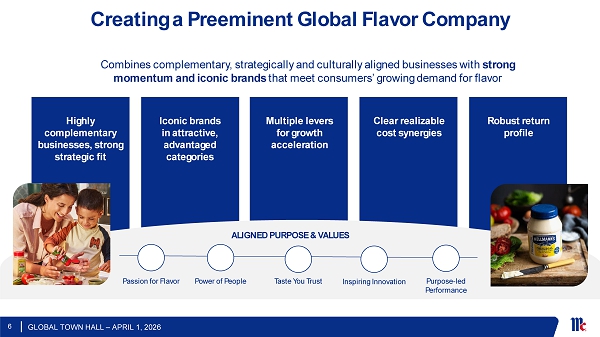 6 6 GLOBAL TOWN HALL – APRIL 1, 2026 Highly complementary businesses, strong strategic fit Robust return profile Clear realizable cost synergies Iconic brands in attractive, advantaged categories Multiple levers for growth acceleration Combines complementary, strategically and culturally aligned businesses with strong momentum and iconic brands that meet consumers’ growing demand for flavor ALIGNED PURPOSE & VALUES Passion for Flavor Power of People Taste You Trust Inspiring Innovation Purpose - led Performance Creating a Preeminent Global Flavor Company