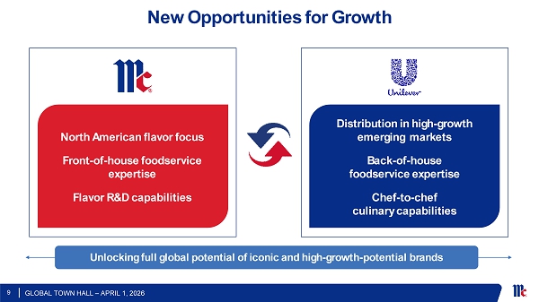 8 GLOBAL TOWN HALL – APRIL 1, 2026 Sources: Euromonitor, 2025; Circana Scan Panel, L52 Weeks Ending 11/30/25; Berenberg Notes: Unilever Foods' sales and other metrics are based on management estimates. 1. Combined sales figure represents McCormick’s net sales for the fiscal year ended November 30, 2025, and Unilever Foods based on 2025 preliminary carve - out financial information, prepared under IFRS and translated from EUR to USD at the Unilever 2025 averag e rate of ($1.124:€1.00). 2. FY25 reflects McCormick’s business including McCormick de Mexico and Unilever Foods’ business excluding business in India, Ne pal and Portugal; its Lifestyle & Nutrition business; its Buavita business; and its Lipton Ready - to - Drink business (together, “Excluded Businesses”). Unilever Foods' sales and other metrics are based on management estimates. See “Non - GAAP and Other Financial Information” for discussion of inclusion of McCormick de Mexico earnings. 3. Categories defined as herbs, spices, seasonings, bouillon, condiments and sauces. 4. North America excludes Mexico. Local Favorites Iconic High - Growth Potential 70% 30% 51% 32% 17% Americas Geographies Channels APAC Consumer Flavor Solutions / Foodservice EMEA Powerful Brand Portfolio Scale Focused Resilient Well - Positioned Combined company will be well - positioned in attractive categories that prioritize flavor rather than compete for calories Combining Strengths to Expand Our Growth Potential $20B 1 Combined Company FY25 Net Sales 2 In Advantaged Categories 3
