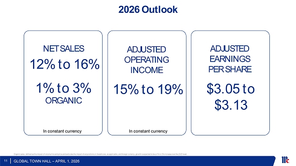 10 10 GLOBAL TOWN HALL – APRIL 1, 2026 First Quarter Performance Top and bottom line benefitted from McCormick de Mexico performance Organic sales growth of 1% was driven by pricing with volumes in line with plan Profitability reflects acquisition accretion and inflation mitigation strategies Remain confident in achieving our outlook for 2026 Organic sales is a Non - GAAP financial measure. See the accompanying Non - GAAP information and reconciliations in the appendix. Well Positioned to Drive Sustained Profitable Growth
