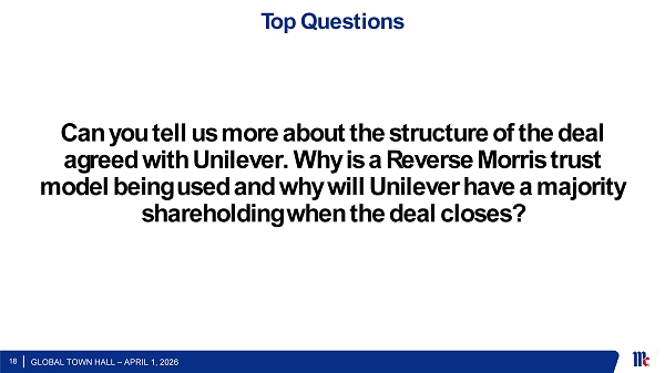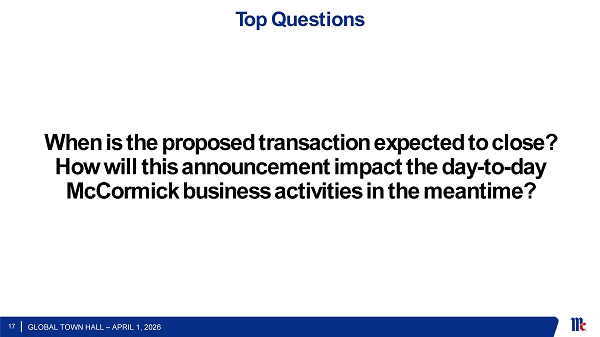 17 17 GLOBAL TOWN HALL – APRIL 1, 2026 17 When is the proposed transaction expected to close? How will this announcement impact the day - to - day McCormick business activities in the meantime? Top Questions