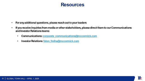 22 22 GLOBAL TOWN HALL – APRIL 1, 2026 22 • For any additional questions, please reach out to your leaders • If you receive inquiries from media or other stakeholders, please direct them to our Communications and Investor Relations teams • Communications: corporate_communications@mccormick.com • Investor Relations: faten_freiha@mccormick.com Resources
