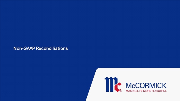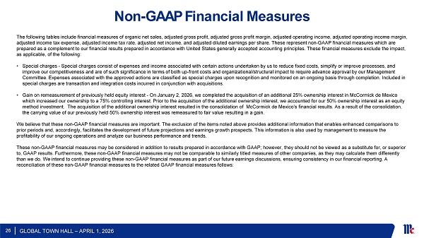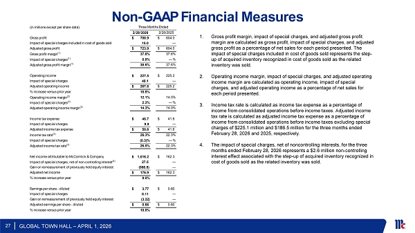 26 26 GLOBAL TOWN HALL – APRIL 1, 2026 Non - GAAP Financial Measures The following tables include financial measures of organic net sales, adjusted gross profit, adjusted gross profit margin, ad jus ted operating income, adjusted operating income margin, adjusted income tax expense, adjusted income tax rate, adjusted net income, and adjusted diluted earnings per share. These re pre sent non - GAAP financial measures which are prepared as a complement to our financial results prepared in accordance with United States generally accepted accounting pri nci ples. These financial measures exclude the impact, as applicable, of the following: • Special charges - Special charges consist of expenses and income associated with certain actions undertaken by us to reduce fixe d costs, simplify or improve processes, and improve our competitiveness and are of such significance in terms of both up - front costs and organizational/structural impact to require advance approval by our Management Committee. Expenses associated with the approved actions are classified as special charges upon recognition and monitored on an ongoing basis through completion. Included in special charges are transaction and integration costs incurred in conjunction with acquisitions. • Gain on remeasurement of previously held equity interest - On January 2, 2026, we completed the acquisition of an additional 25% ownership interest in McCormick de Mexico which increased our ownership to a 75% controlling interest. Prior to the acquisition of the additional ownership interest, w e a ccounted for our 50% ownership interest as an equity method investment. The acquisition of the additional ownership interest resulted in the consolidation of McCormick de Mexic o's financial results. As a result of the consolidation, the carrying value of our previously held 50% ownership interest was remeasured to fair value resulting in a gain. We believe that these non - GAAP financial measures are important. The exclusion of the items noted above provides additional info rmation that enables enhanced comparisons to prior periods and, accordingly, facilitates the development of future projections and earnings growth prospects. This informa tio n is also used by management to measure the profitability of our ongoing operations and analyze our business performance and trends. These non - GAAP financial measures may be considered in addition to results prepared in accordance with GAAP; however, they shoul d not be viewed as a substitute for, or superior to, GAAP results. Furthermore, these non - GAAP financial measures may not be comparable to similarly titled measures of other com panies, as they may calculate them differently than we do. We intend to continue providing these non - GAAP financial measures as part of our future earnings discussions, ensuri ng consistency in our financial reporting. A reconciliation of these non - GAAP financial measures to the related GAAP financial measures follows: