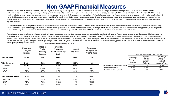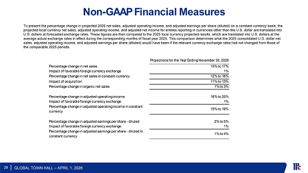 28 28 GLOBAL TOWN HALL – APRIL 1, 2026 Non - GAAP Financial Measures Because we are a multi - national company, we are subject to variability of our reported U.S. dollar results due to changes in for eign currency exchange rates. Those changes can be volatile. The exclusion of the effects of foreign currency exchange, or what we refer to as amounts expressed “on a constant currency basis ,” is a non - GAAP measure. We believe that this non - GAAP measure provides additional information that enables enhanced comparison to prior periods excluding the translation effects of change s i n rates of foreign currency exchange and provides additional insight into the underlying performance of our operations located outside of the U.S. It should be noted that our presentation herein of a mou nts and percentage changes on a constant currency basis does not exclude the impact of foreign currency transaction gains and losses (that is, the impact of transactions denominated in other th an the local currency of any of our subsidiaries in their local currency reported results). We provide organic net sales growth rates for our consolidated net sales and segment net sales. We believe that organic net s ale s growth rates provide useful information to investors because they provide transparency to underlying performance in our net sales by excluding the effect that foreign currency exchange rate f luc tuations, acquisitions, and divestitures, as applicable, have on year - to - year comparability. A reconciliation of these measures from reported net sales growth rates, the relevant GAAP measures, are inc luded in the tables set forth below. Percentage changes in sales and adjusted operating income expressed on a constant currency basis are presented excluding the imp act of foreign currency exchange. To present this information for historical periods, current period results for entities reporting in currencies other than the U.S. dollar are translated int o U .S. dollars at the average exchange rates in effect during the corresponding period of the comparative year, rather than at the actual average exchange rates in effect during the current fiscal year. As a result, the foreign currency impact is equal to the current year results in local currencies multiplied by the change in the average foreign currency exchange rate between the current fiscal period and the c orr esponding period of the comparative year. Rates of constant currency and organic growth (decline) follow: Percentage Change as Reported Impact of Foreign Currency Exchange Percentage Change on a Constant Currency Basis Impact of Acquisition Percentage Change on an Organic Basis Total net sales 16.7% 3.1% 13.6% 12.4% 1.2% Total Consumer 24.5% 2.9% 21.6% 19.8% 1.8% Americas 30.4% 0.3% 30.1% 28.9% 1.2% EMEA 15.5% 11.8% 3.7% — % 3.7% APAC 6.2% 4.0% 2.2% — % 2.2% Total Flavor Solutions 6.2% 3.3% 2.9% 2.4% 0.5% Americas 6.1% 1.9% 4.2% 3.4% 0.8% EMEA 7.3% 7.8% (0.5)% — % (0.5)% APAC 5.1% 4.6% 0.5% — % 0.5% Three months ended February 28, 2026 Percentage Change as Reported Impact of Foreign Currency Exchange Percentage Change on Constant Currency Basis Total adjusted operating income 18.8% 2.8% 16.0% Consumer segment 22.4% 1.9% 20.5% Flavor Solutions segment 12.1% 4.6% 7.5% Three months ended February 28, 2026