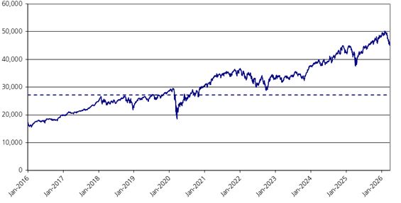 27,129.684, which is equal to 60.00% of the initial index value of the Dow Jones Industrial Average®