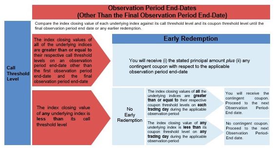 The securities will not be redeemed early on any contingent coupon payment date if the index closing value of any underlying index is below its call threshold level on