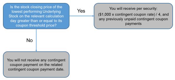 On each contingent coupon payment date, you will receive a contingent coupon payment at a per annum rate equal to the contingent coupon rate if, and only if, the stock closing price of the lowest performing Underlying Stock on the related calculation day is greater than or equal to its coupon threshold price. Each “contingent coupon payment,” if any, will be