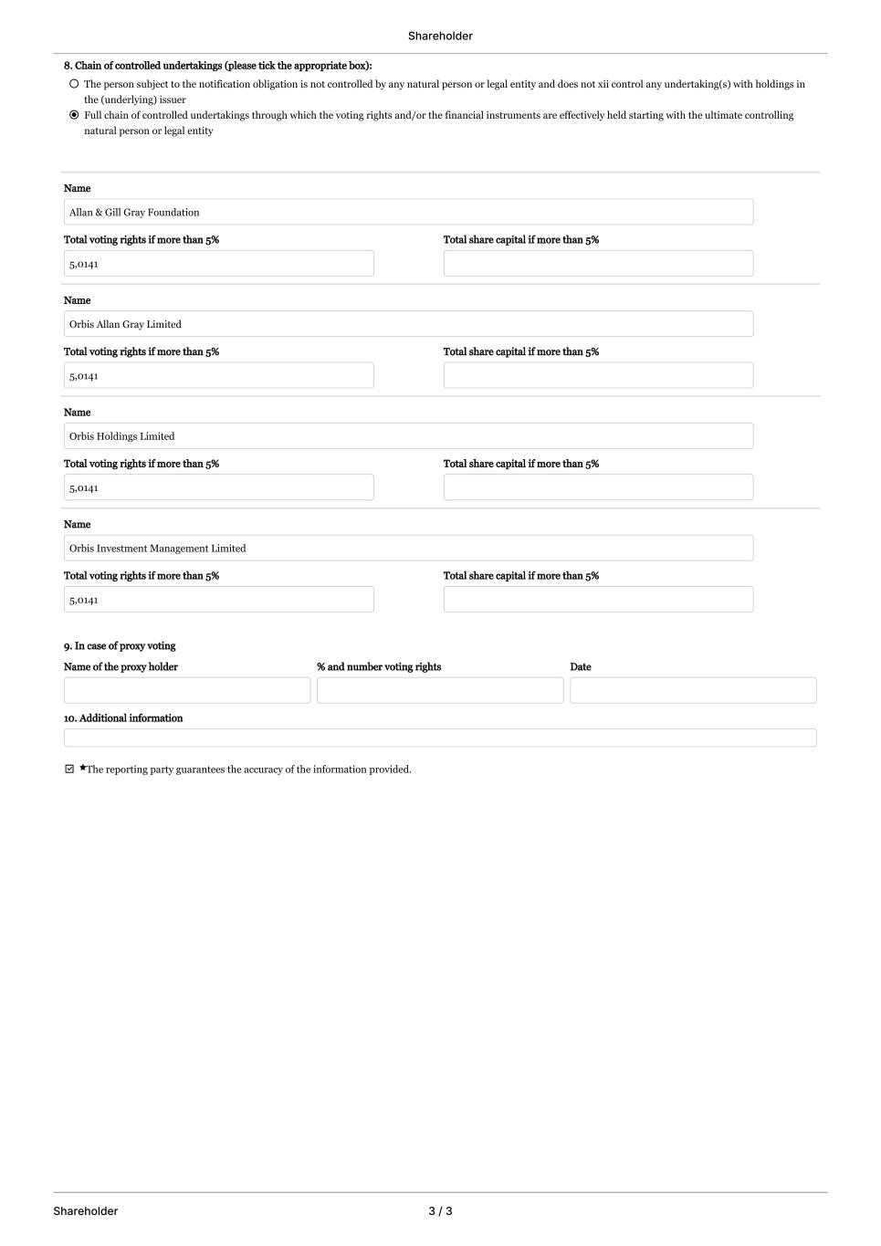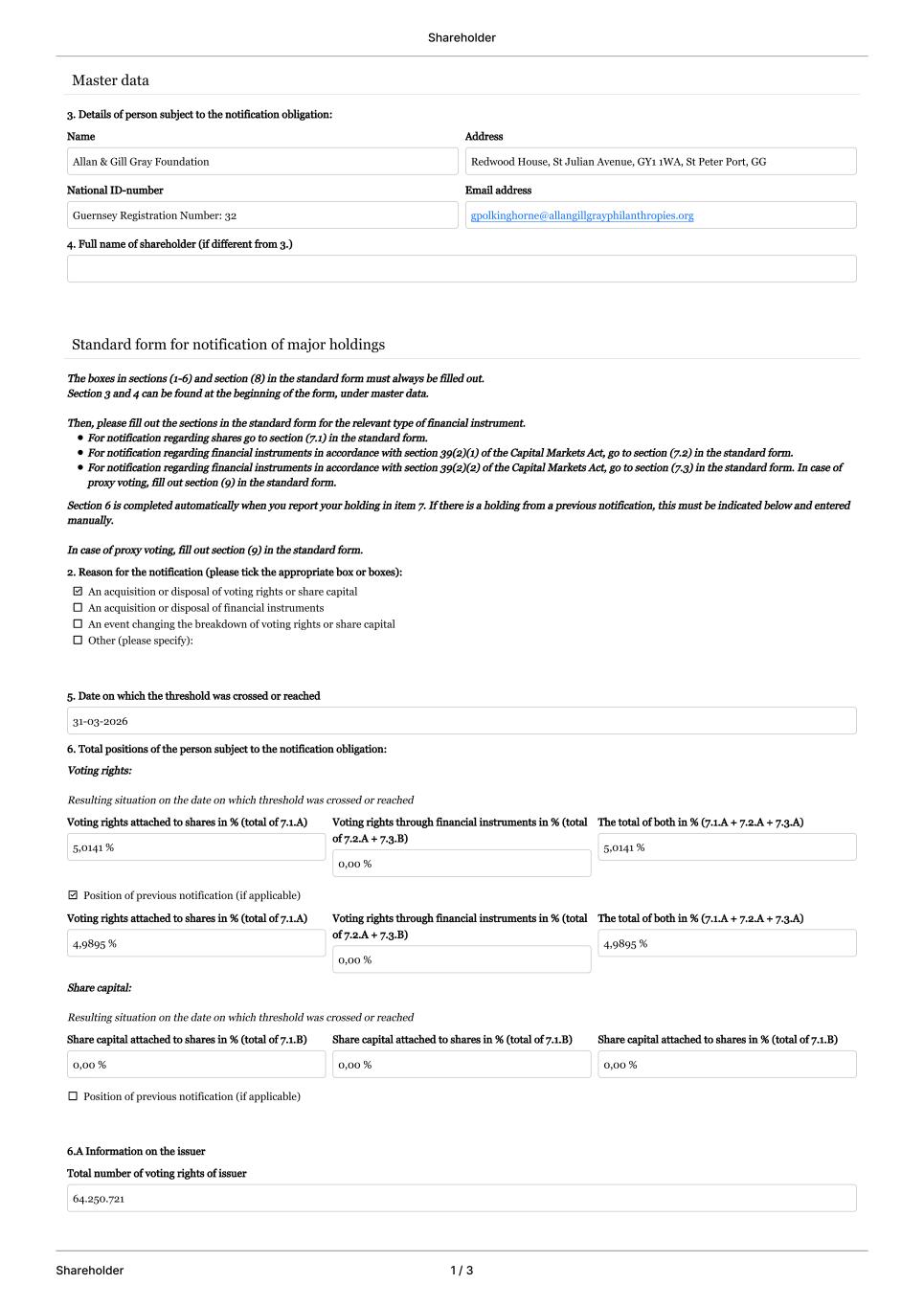 Shareholder Shareholder 1 / 3 Master data Standard form for notification of major holdings 3. Details of person subject to the notification obligation: Name Allan & Gill Gray Foundation Address Redwood House, St Julian Avenue, GY1 1WA, St Peter Port, GG National ID-number Guernsey Registration Number: 32 Email address gpolkinghorne@allangillgrayphilanthropies.org 4. Full name of shareholder (if different from 3.) The boxes in sections (1-6) and section (8) in the standard form must always be filled out. Section 3 and 4 can be found at the beginning of the form, under master data. Then, please fill out the sections in the standard form for the relevant type of financial instrument. For notification regarding shares go to section (7.1) in the standard form. For notification regarding financial instruments in accordance with section 39(2)(1) of the Capital Markets Act, go to section (7.2) in the standard form. For notification regarding financial instruments in accordance with section 39(2)(2) of the Capital Markets Act, go to section (7.3) in the standard form. In case of proxy voting, fill out section (9) in the standard form. Section 6 is completed automatically when you report your holding in item 7. If there is a holding from a previous notification, this must be indicated below and entered manually. In case of proxy voting, fill out section (9) in the standard form. Other (please specify): An event changing the breakdown of voting rights or share capital An acquisition or disposal of financial instruments An acquisition or disposal of voting rights or share capital 2. Reason for the notification (please tick the appropriate box or boxes): 5. Date on which the threshold was crossed or reached 31-03-2026 6. Total positions of the person subject to the notification obligation: Voting rights: Resulting situation on the date on which threshold was crossed or reached Voting rights attached to shares in % (total of 7.1.A) 5,0141 % Voting rights through financial instruments in % (total of 7.2.A + 7.3.B) 0,00 % The total of both in % (7.1.A + 7.2.A + 7.3.A) 5,0141 % Position of previous notification (if applicable) Voting rights attached to shares in % (total of 7.1.A) 4,9895 % Voting rights through financial instruments in % (total of 7.2.A + 7.3.B) 0,00 % The total of both in % (7.1.A + 7.2.A + 7.3.A) 4,9895 % Share capital: Resulting situation on the date on which threshold was crossed or reached Share capital attached to shares in % (total of 7.1.B) 0,00 % Share capital attached to shares in % (total of 7.1.B) 0,00 % Share capital attached to shares in % (total of 7.1.B) 0,00 % Position of previous notification (if applicable) 6.A Information on the issuer Total number of voting rights of issuer 64.250.721