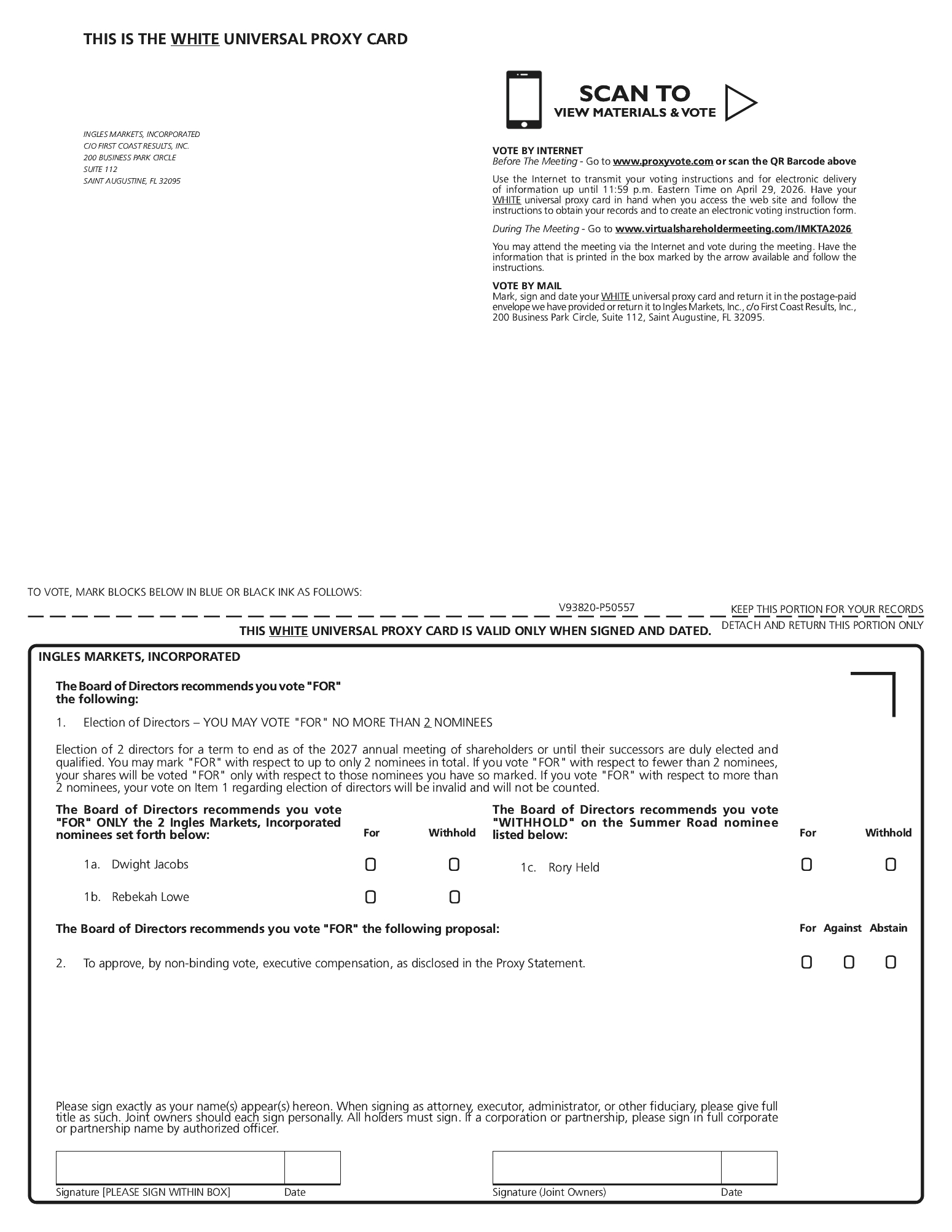 Stockholders are encouraged to submit their votes on the WHITE universal proxy card. If the Dissident Shareholder withdraws or abandons its solicitation or fails to comply with the universal proxy rules after a shareholder has already granted proxy authority to the Dissident Shareholder, shareholders can still sign and date a later submitted WHITE universal proxy card, vote over the Internet by following the instructions provided on the enclosed WHITE universal proxy card or voting instruction form or virtually attend and vote at the Annual Meeting.