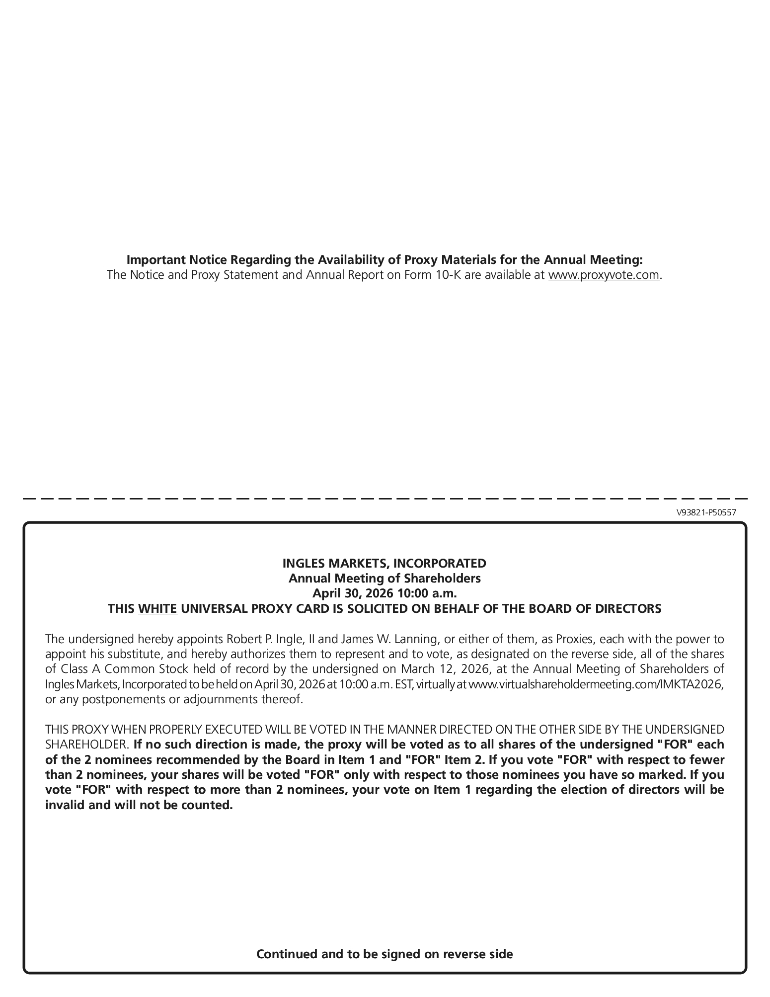 The Board of Directors (the “Board”) of Ingles Markets, Incorporated (the “Company”, “we”, “us”, “our” or “Ingles Markets”) furnishes you with this Proxy Statement to solicit proxies to be voted at the 2026 Annual Meeting of Shareholders of the Company (the “Annual Meeting”). The Annual Meeting will be held virtually on Thursday, April 30, 2026, at 10:00 a.m. Eastern Time, at www.virtualshareholdermeeting.com/IMKTA2026 for the purposes set forth in the Notice of Annual Meeting of Shareholders that accompanies this Proxy Statement. The proxies also may be voted at any adjournments or postponements of the Annual Meeting.