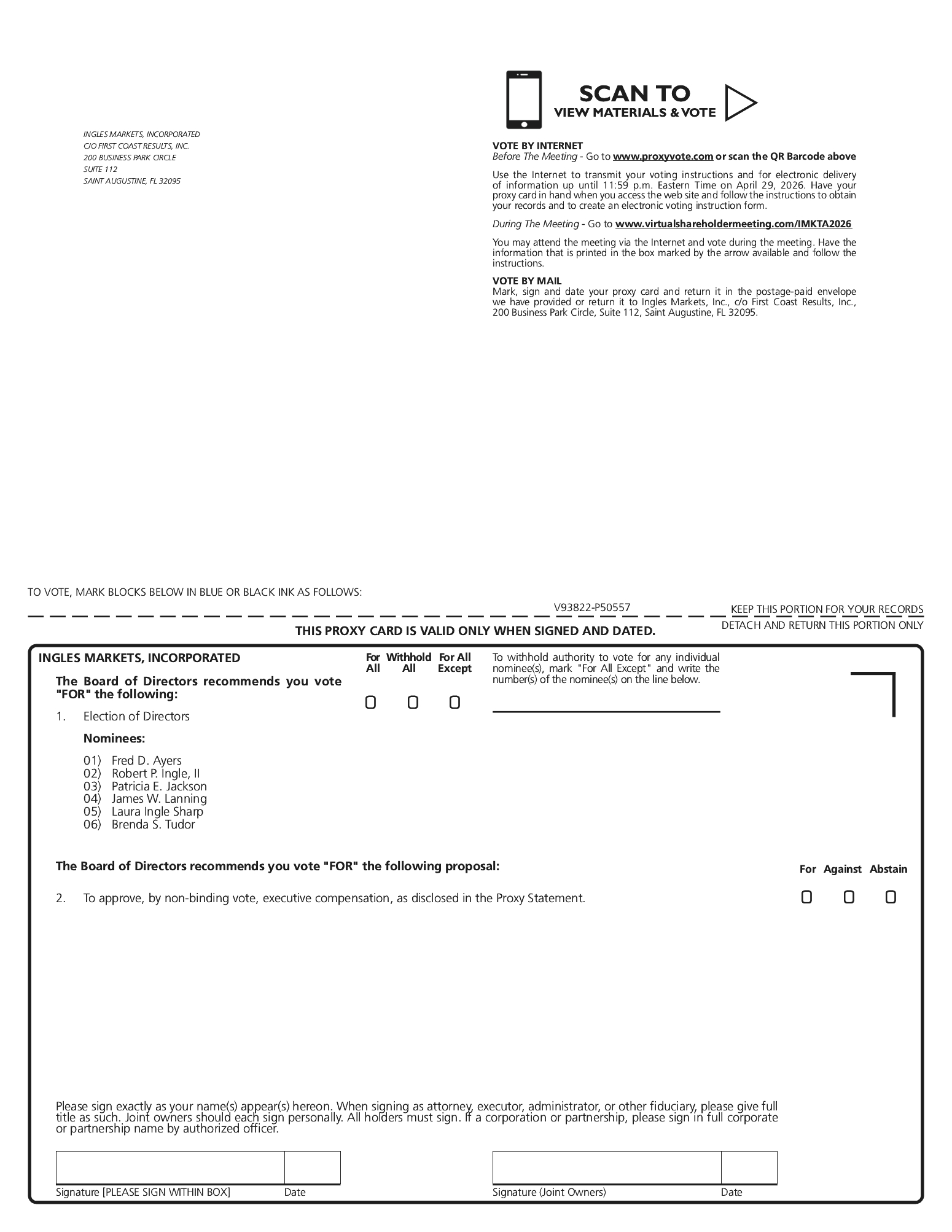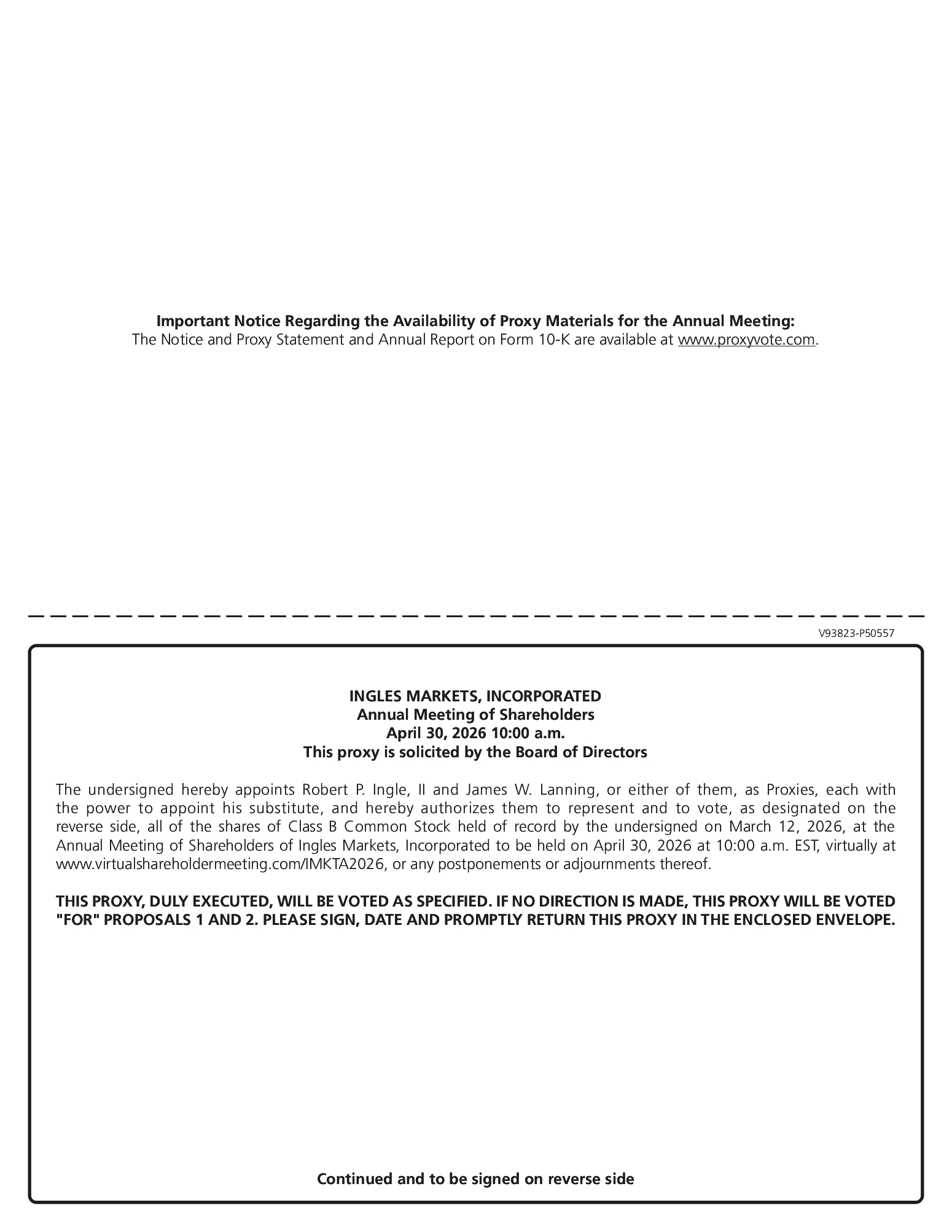NOTICE IS HEREBY GIVEN that Ingles Markets, Incorporated (the “Company”) will hold its 2026 Annual Meeting of Shareholders (the “Annual Meeting”) virtually on Thursday, April 30, 2026, at 10:00 a.m. Eastern Time. The Annual Meeting will be a completely virtual meeting of the shareholders conducted via live webcast. You will be able to attend the Annual Meeting by visiting www.virtualshareholdermeeting.com/IMKTA2026. The Annual Meeting is being held for the following purposes: