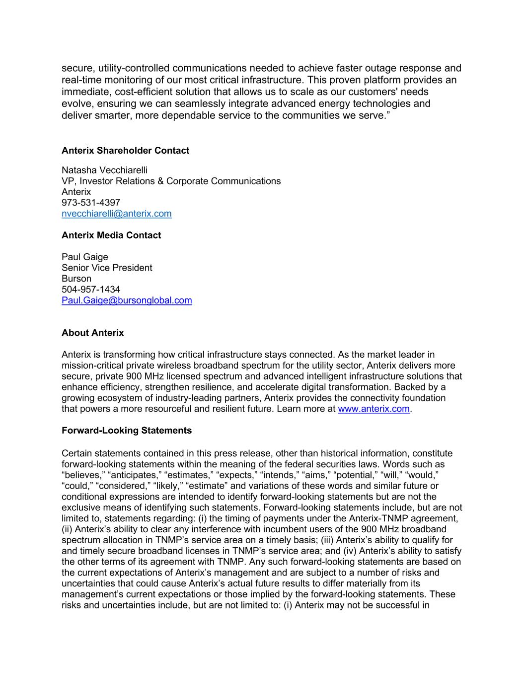 secure, utility-controlled communications needed to achieve faster outage response and real-time monitoring of our most critical infrastructure. This proven platform provides an immediate, cost-efficient solution that allows us to scale as our customers' needs evolve, ensuring we can seamlessly integrate advanced energy technologies and deliver smarter, more dependable service to the communities we serve.” Anterix Shareholder Contact Natasha Vecchiarelli VP, Investor Relations & Corporate Communications Anterix 973-531-4397 nvecchiarelli@anterix.com Anterix Media Contact Paul Gaige Senior Vice President Burson 504-957-1434 Paul.Gaige@bursonglobal.com About Anterix Anterix is transforming how critical infrastructure stays connected. As the market leader in mission-critical private wireless broadband spectrum for the utility sector, Anterix delivers more secure, private 900 MHz licensed spectrum and advanced intelligent infrastructure solutions that enhance efficiency, strengthen resilience, and accelerate digital transformation. Backed by a growing ecosystem of industry-leading partners, Anterix provides the connectivity foundation that powers a more resourceful and resilient future. Learn more at www.anterix.com. Forward-Looking Statements Certain statements contained in this press release, other than historical information, constitute forward-looking statements within the meaning of the federal securities laws. Words such as “believes,” “anticipates,” “estimates,” “expects,” “intends,” “aims,” “potential,” “will,” “would,” “could,” “considered,” “likely,” “estimate” and variations of these words and similar future or conditional expressions are intended to identify forward-looking statements but are not the exclusive means of identifying such statements. Forward-looking statements include, but are not limited to, statements regarding: (i) the timing of payments under the Anterix-TNMP agreement, (ii) Anterix’s ability to clear any interference with incumbent users of the 900 MHz broadband spectrum allocation in TNMP’s service area on a timely basis; (iii) Anterix’s ability to qualify for and timely secure broadband licenses in TNMP’s service area; and (iv) Anterix’s ability to satisfy the other terms of its agreement with TNMP. Any such forward-looking statements are based on the current expectations of Anterix’s management and are subject to a number of risks and uncertainties that could cause Anterix’s actual future results to differ materially from its management’s current expectations or those implied by the forward-looking statements. These risks and uncertainties include, but are not limited to: (i) Anterix may not be successful in