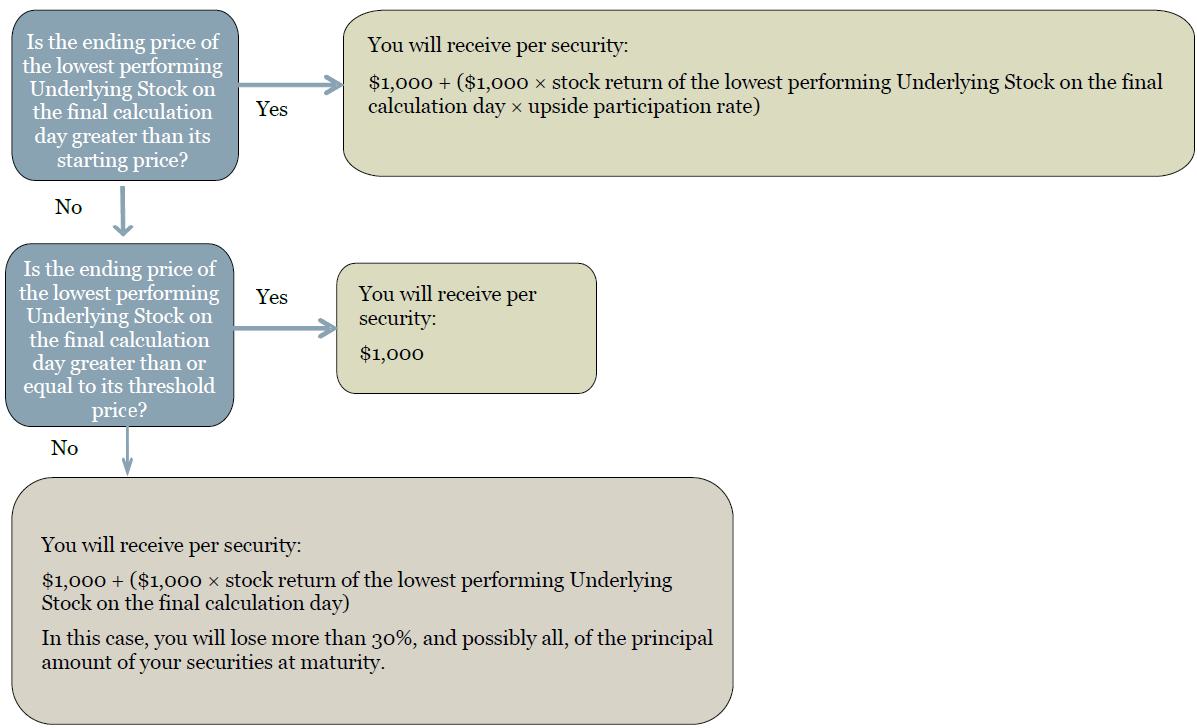 If the securities are not automatically called on the call date, you will be entitled to receive on the stated maturity date a cash payment per security in U.S. dollars equal to the maturity payment amount. The “maturity payment amount” per security will equal: · if the ending price of the lowest performing Underlying Stock on the final calculation day is greater than its starting price: $1,000 + ($1,000 × stock return of the lowest performing Underlying Stock on the final calculation day × upside participation rate); · if the ending price of the lowest performing Underlying Stock on the final calculation day is less than or equal to its starting price, but greater than or equal to its threshold price: $1,000; or · if the ending price of the lowest performing Underlying Stock on the final calculation day is less than its threshold price: $1,000 + ($1,000 × stock return of the lowest performing Underlying Stock on the final calculation day) If the securities are not automatically called and the ending price of the lowest performing Underlying Stock on the final calculation day is less than its threshold price, you will have full downside exposure to the decrease in the price of that Underlying Stock from its starting price and you will lose more than 30%, and possibly all, of the principal amount of your securities at maturity. |