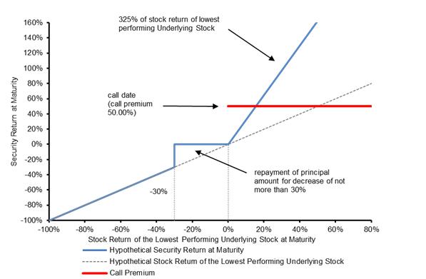 Because the hypothetical stock closing price of the lowest performing Underlying Stock on the call date is greater than its hypothetical starting price, the securities are automatically called on the call date and you will receive on the call settlement date the principal amount of your securities plus the call premium of 50.00% of the principal amount. Even though the lowest performing Underlying Stock on the call date appreciated by 70.00% from its hypothetical starting price to its hypothetical stock closing price on the call date in this example, your return is limited to the call premium of 50.00%.