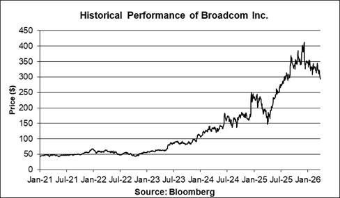 The following graph sets forth the historical performance of the common stock of Broadcom Inc. based on the daily historical closing prices of the common stock of Broadcom Inc. from January 4, 2021 through March 30, 2026. The closing price of the common stock of Broadcom Inc. on March 30, 2026 was $293.41. We obtained the closing prices above and below from the Bloomberg Professional® service (“Bloomberg”), without independent verification. The closing prices above and below may have been adjusted by Bloomberg for corporate actions, such as stock splits, public offerings, mergers and acquisitions, spin-offs, delistings and bankruptcy.