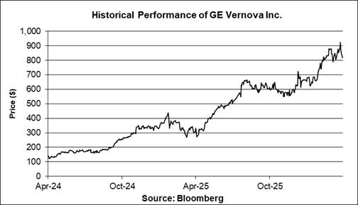 The following graph sets forth the historical performance of the common stock of GE Vernova Inc. based on the daily historical closing prices of the common stock of GE Vernova Inc. from April 2, 2024 through March 30, 2026. The common stock of GE Vernova Inc. commenced trading on the New York Stock Exchange on April 2, 2024 and therefore has limited historical performance. The closing price of the common stock of GE Vernova Inc. on March 30, 2026 was $817.35. We obtained the closing prices above and below from Bloomberg, without independent verification. The closing prices above and below may have been adjusted by Bloomberg for corporate actions, such as stock splits, public offerings, mergers and acquisitions, spin-offs, delistings and bankruptcy.