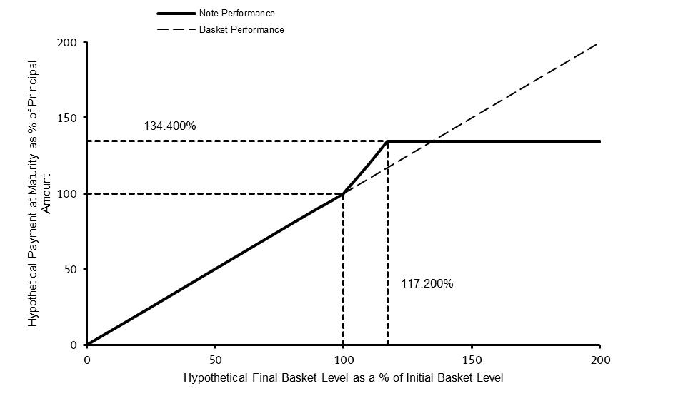 | · | if the final basket level is greater than the initial basket level but less than the cap level, the sum of (i) $1,000 plus (ii) the product of (a) $1,000 times (b) the upside participation rate times (c) the basket return; or |