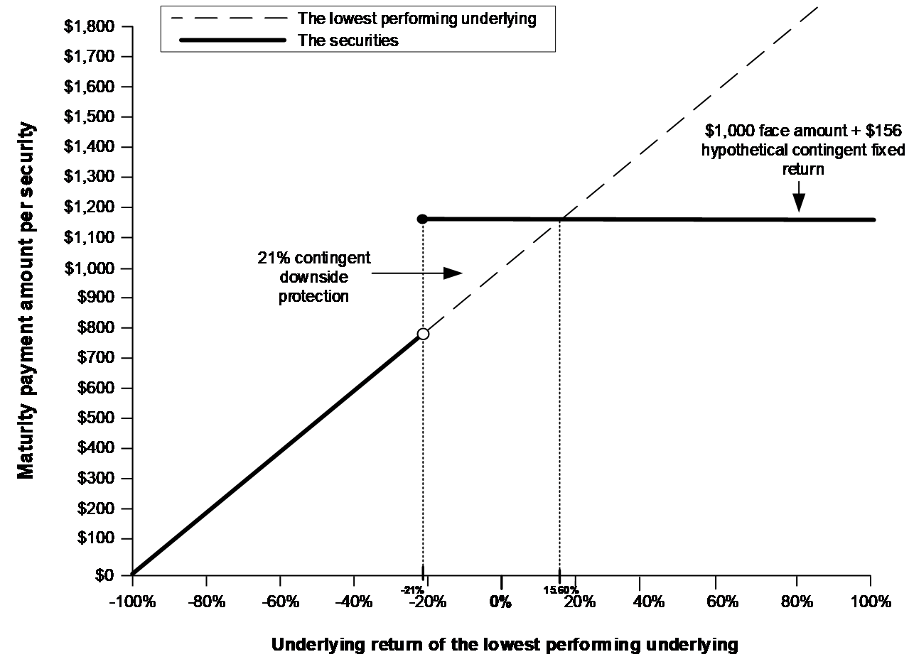 At maturity, the maturity payment amount per $1,000 face amount of securities will be determined as follows: ●If the ending level of the lowest performing underlying is greater than or equal to its threshold level: $1,000 + contingent fixed return; or ●If the ending level of the lowest performing underlying is less than its threshold level: $1,000 + ($1,000 × underlying return of lowest performing underlying)