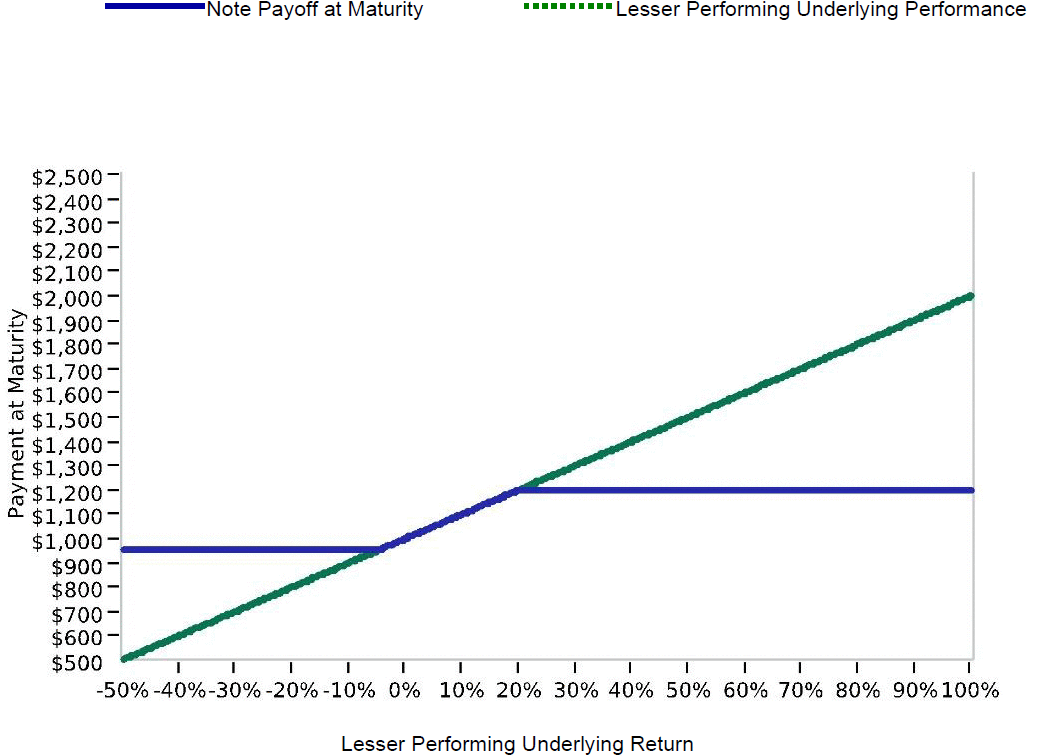 The hypothetical Initial Value of the Lesser Performing Underlying of 100.00 has been chosen for illustrative purposes only and does not represent the actual Initial Value of either Underlying. The actual Initial Value of each Underlying is the closing value of that Underlying on the Pricing Date and is specified under “Key Terms — Initial Value” in this pricing supplement. For historical data regarding the actual closing values of each Underlying, please see the historical information set forth under “The Underlyings” in this pricing supplement.