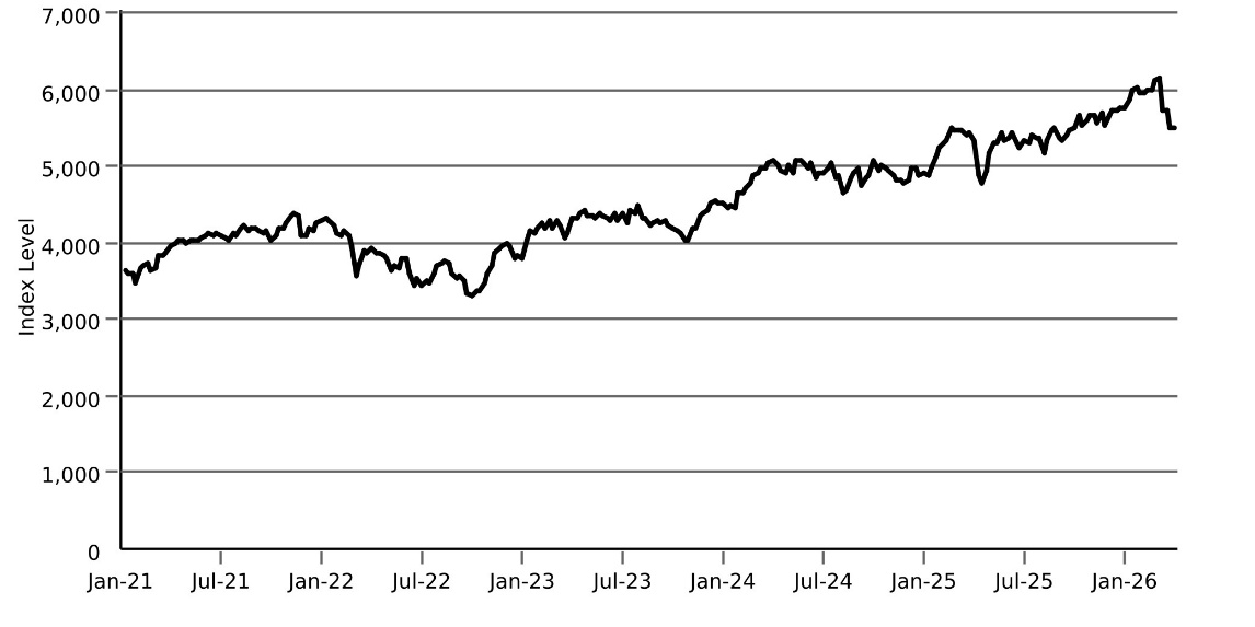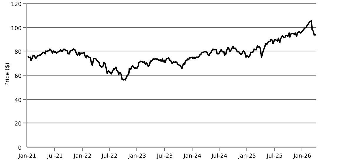 The following graphs set forth the historical performance of each Underlying based on the weekly historical closing values from January 8, 2021 through March 27, 2026. The closing value of the Fund on March 30, 2026 was $94.07. The closing value of the Index on March 30, 2026 was 5,541.79. We obtained the closing values above and below from the Bloomberg Professional® service (“Bloomberg”), without independent verification. The closing values of the Fund above and below may have been adjusted by Bloomberg for actions taken by the Fund, such as stock splits.