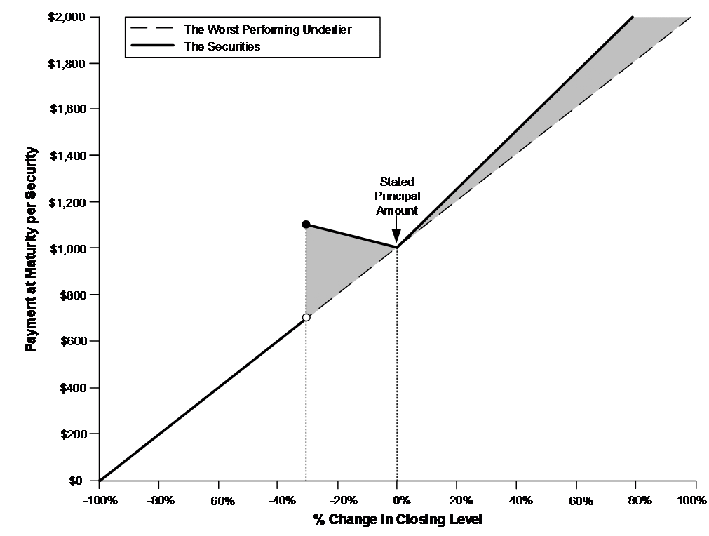 The payment at maturity will be based solely on the performance of the worst performing underlier, which could be either underlier. The payoff diagram and table below illustrate the payment at maturity for a range of hypothetical performances of the worst performing underlier over the term of the securities.