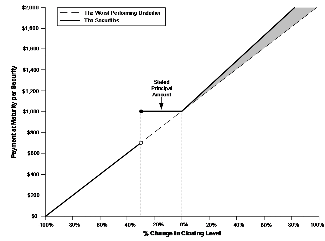 The payment at maturity will be based solely on the performance of the worst performing underlier, which could be either underlier. The payoff diagram and table below illustrate the payment at maturity for a range of hypothetical performances of the worst performing underlier over the term of the securities.