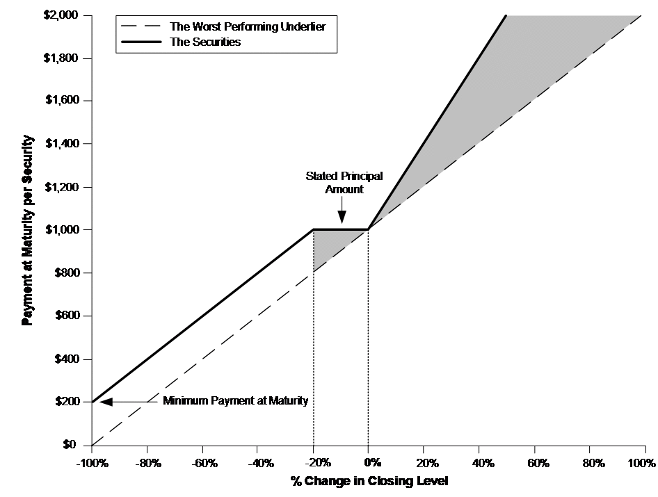 If the worst performing underlier appreciates 5%, investors will receive $1,060 per security, or 106% of the stated principal amount. |